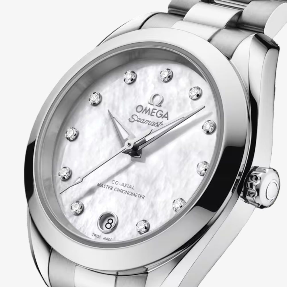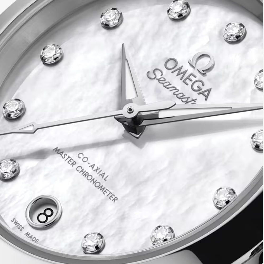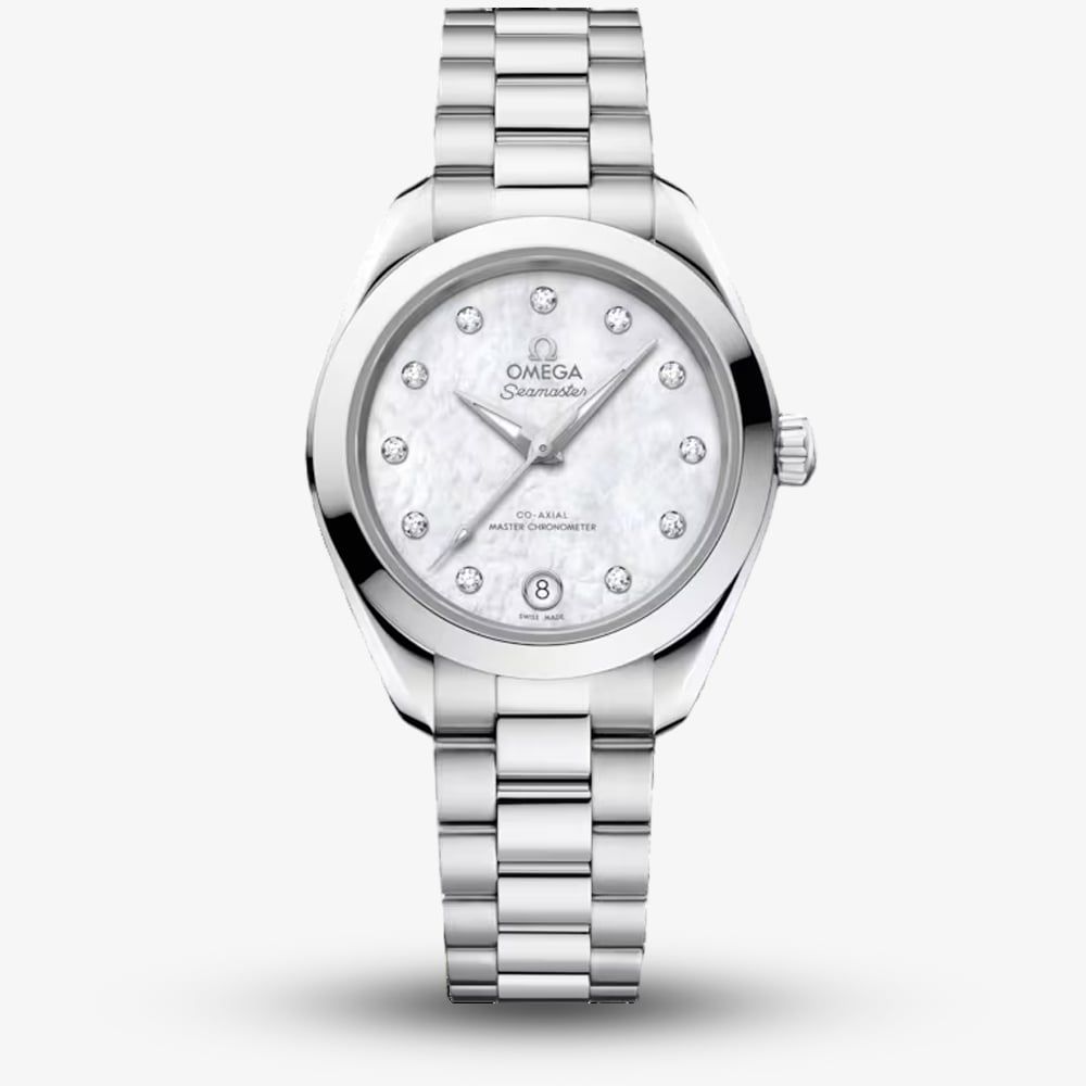 Graceful, sophisticated, and refined, this watch is the perfect fusion of elegance and performance. Its white mother-of-pearl dial is complemented by polished hands and diamond-set hour markers that add a subtle sparkle and unique charm. The 30mm stainless steel case and matching bracelet provide a sleek, comfortable fit, making it ideal for both everyday wear and formal occasions. As stylish as it is practical, this watch is the perfect addition to any collection.