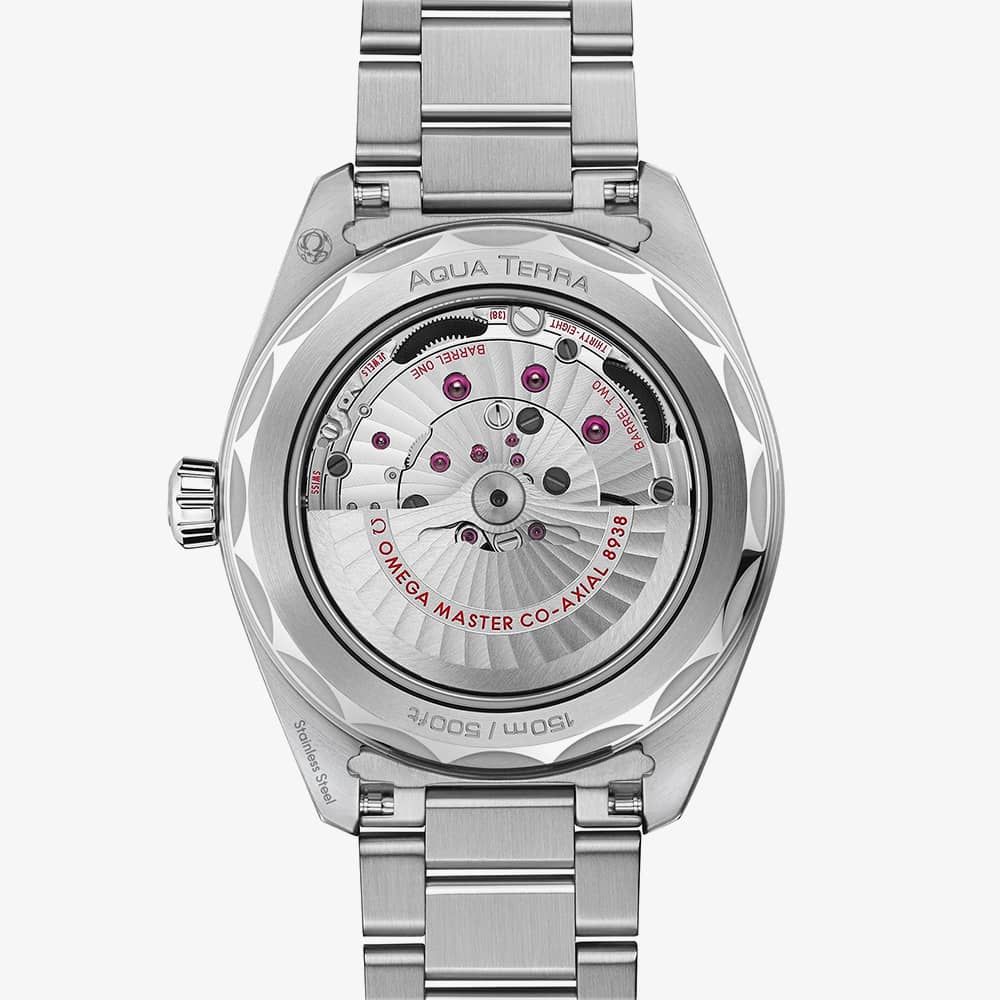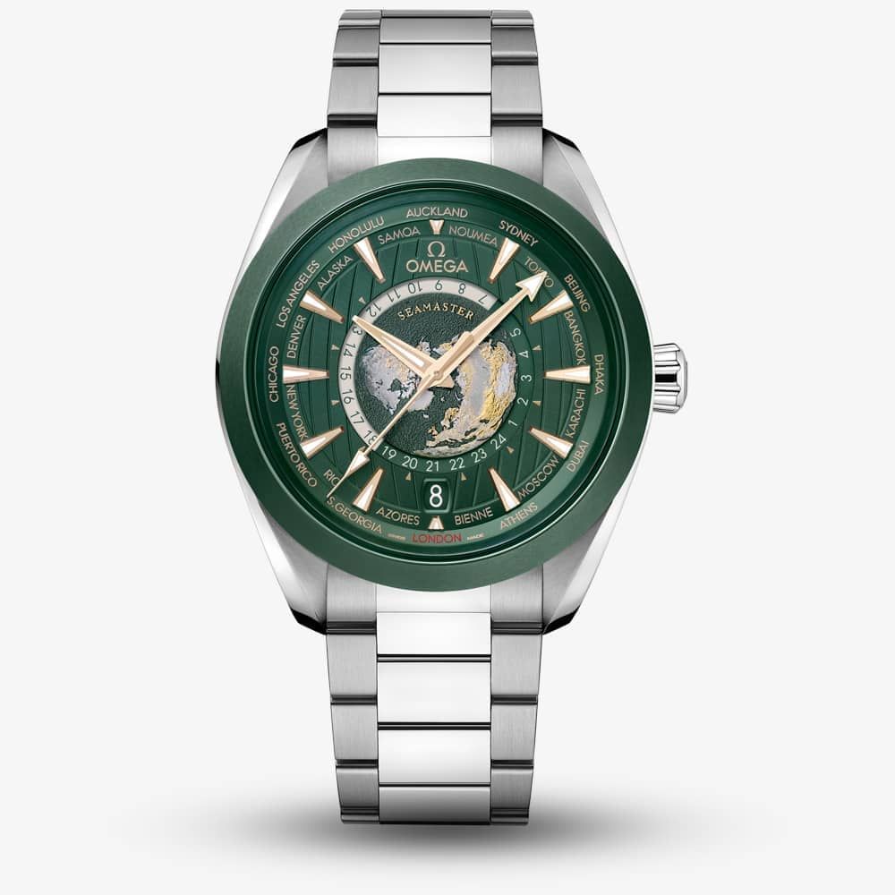 Introducing the Omega Aqua Terra Chronometer GMT World timer like you’ve never seen it before. This version of the world-timer features a stunning and stand out green dial. That really gives this a watch a different perspective on the world timer. The dial also features 18k yellow gold hour markers that gives this watch its elegance. The dial and map are all made from titanium.