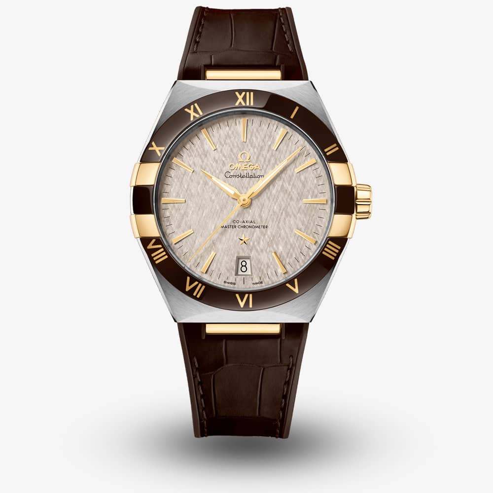 OMEGA Mens Constellation 18ct Yellow Gold Grey Watch 131.23.41.21.06.002 watch combines a 41mm round-shaped stainless-steel case and brown leather strap with a fold-over clasp. It has a grey analogue dial with luminescent hands with 18ct hour markers, watch features a brown and 18ct yellow gold bezel. The dial features a date display which is protected beneath domed scratch-resistant sapphire crystal glass with anti-reflective treatment on both sides. Power is generated by the OMEGA 8900 automatic movement which has a power reserve of 60 hours. This model also has a water resistance of up to 50 metres. Watch is also master chronometer certified.