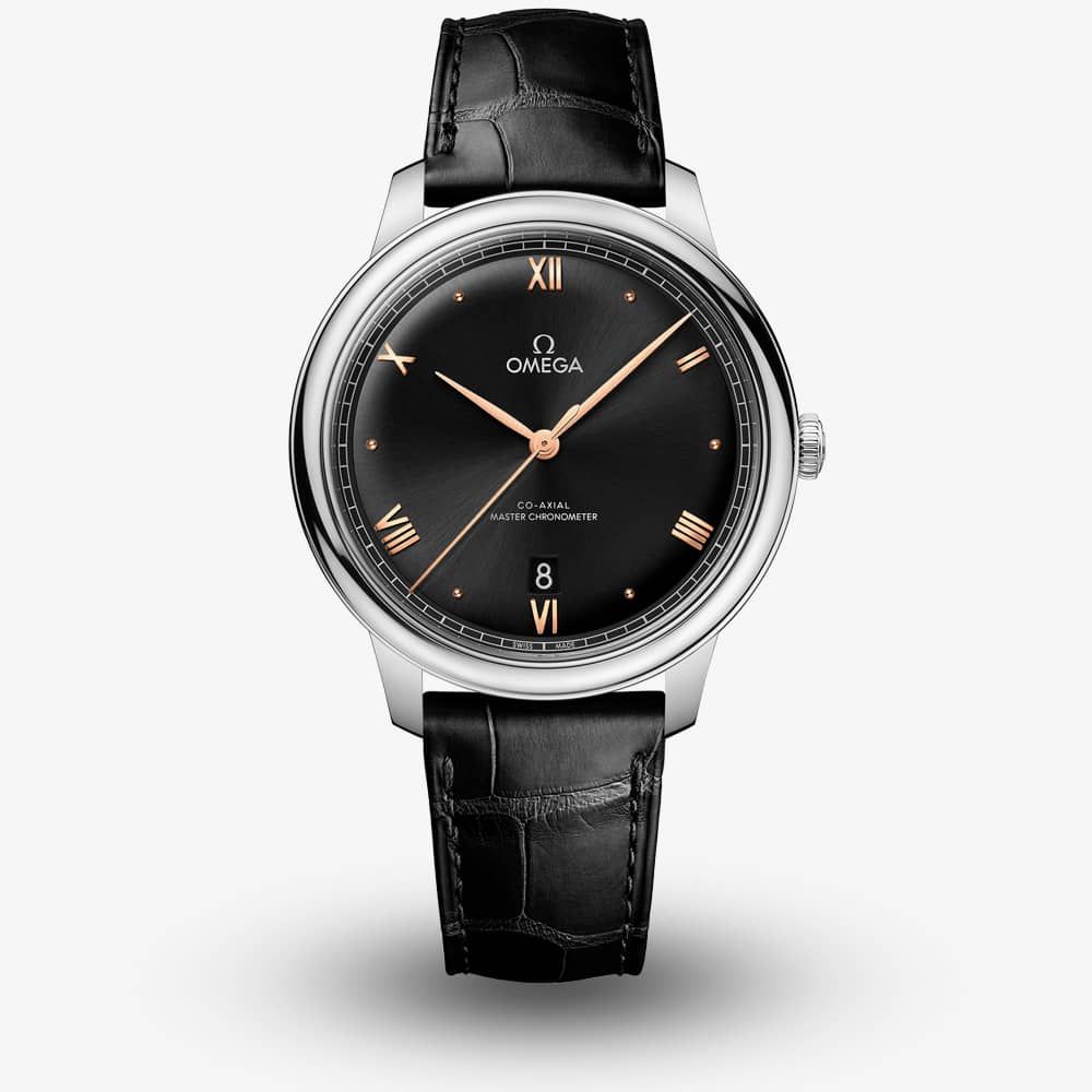 The OMEGA 434.13.40.20.01.001 De Ville Prestige watch combines a 40mm round-shaped stainless steel case and black alligator leather strap with a traditional buckle. It has a PVD black sun-brushed analogue dial with PVD Sedna rose gold hands and indexes.