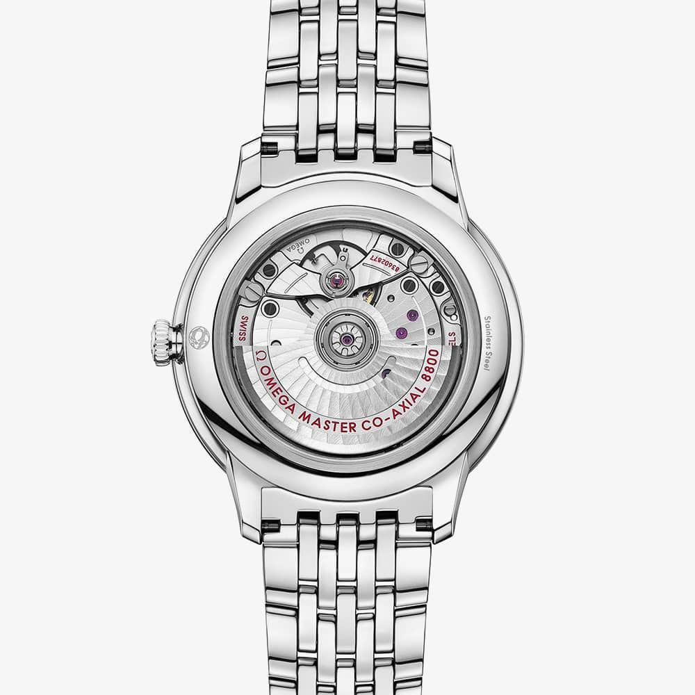 The OMEGA 434.10.40.20.03.001 De Ville Prestige watch combines a 40mm round-shaped stainless steel case and silver stainless steel bracelet with a fold-over clasp. It has a dark blue textured sun-brushed analogue dial with rhodium-plated hands and indexes, protected beneath domed, scratch‑resistant sapphire crystal with anti‑reflective treatment inside. Power is generated by the OMEGA Master Co-Axial Calibre 8800 automatic movement and has an approximate power reserve of 55 hours. This model also has a water resistance of up to 30 metres.