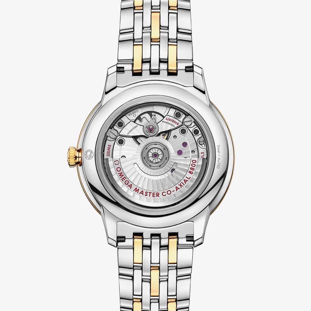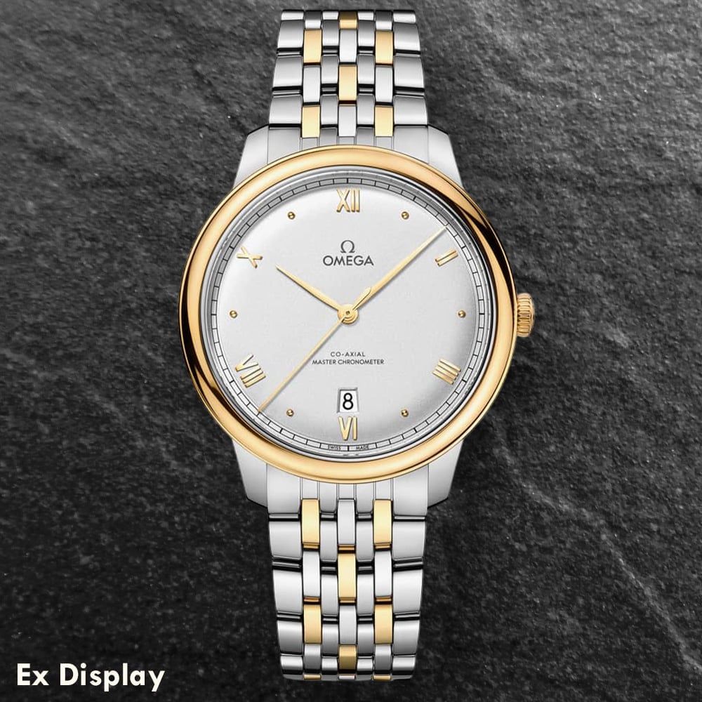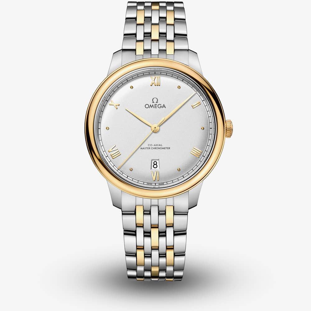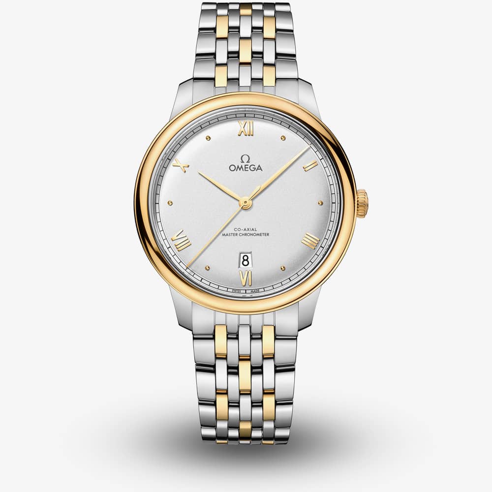 The OMEGA 434.20.40.20.02.002 De Ville Prestige watch combines a 40mm round shaped stainless steel and 18ct yellow gold case and two colour stainless steel bracelet with a fold-over clasp. It has a silvery analogue dial with a crystal finish- and yellow gold-plated hands and indexes. The date is visible at position six, protected beneath domed, scratch‑resistant sapphire crystal with anti‑reflective treatment inside. Power is generated by the OMEGA Master Co-Axial Calibre 8800 automatic movement and has an approximate power reserve of 55 hours and can be seen through the sapphire crystal case back. This model also has a water resistance of up to 30 metres. watch weighs 116g.