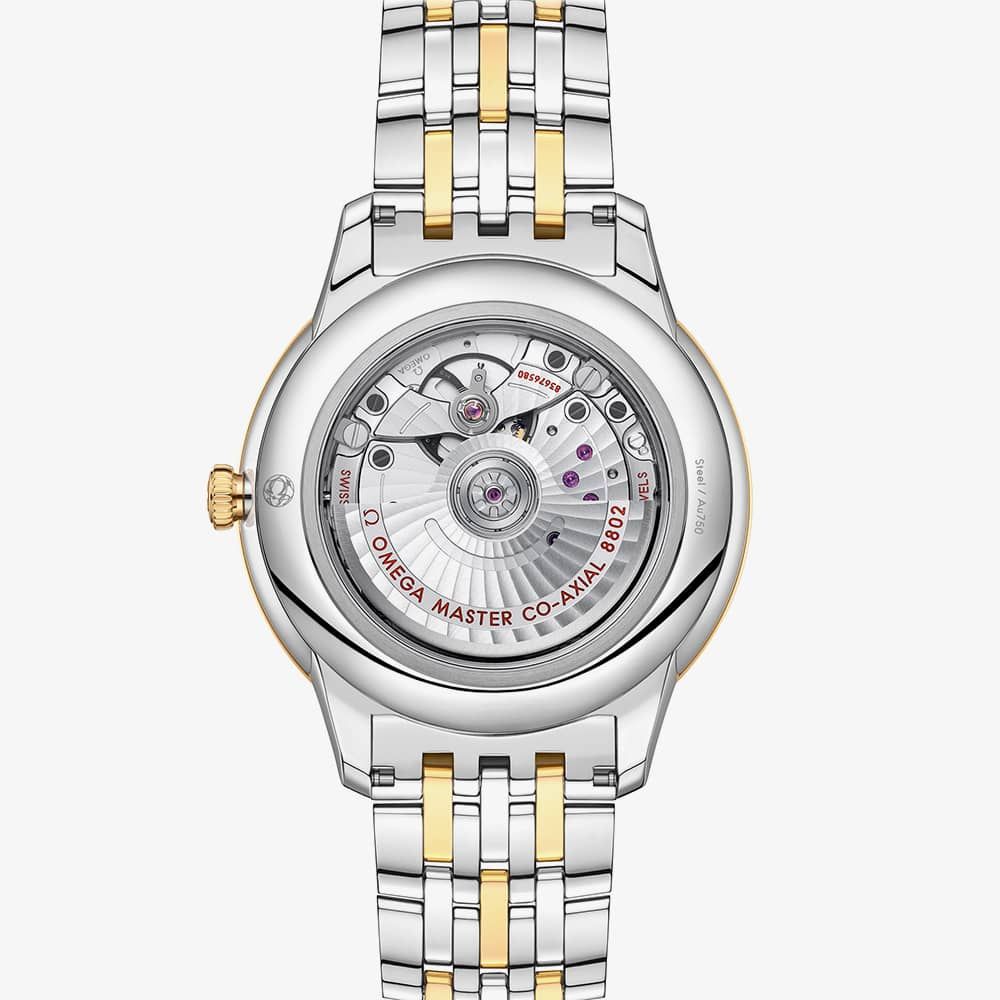 The OMEGA 434.20.41.20.08.001 De Ville Prestige watch combines a 41mm round-shaped 18ct yellow gold stainless steel case and a two-colour stainless steel bracelet with a fold-over clasp. It has a PVD Moonshine gold textured analogue dial with yellow gold plated hands and indexes. The date is visible at position three, protected beneath domed, scratch‑resistant sapphire crystal with anti‑reflective treatment inside. Power is generated by the OMEGA Master Co-Axial Calibre 8802 automatic movement with an approximate power reserve of 55 hours. This model also has a water resistance of up to 30 metres.