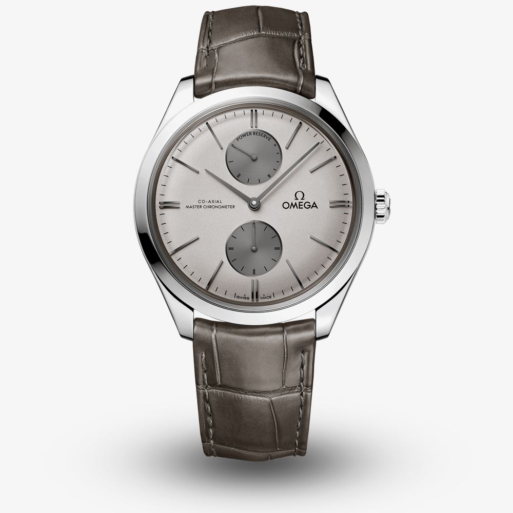 The OMEGA 435.13.40.22.06.001 De Ville watch combines a 40mm round-shaped stainless steel case and a grey textured leather strap with a traditional buckle. It has a small seconds dial and a power reserve dial set within a silvery analogue dial which is protected beneath domed sapphire crystal glass with a NAIAD Lock case back, featuring 18ct white gold domed time markers. Power is generated by Certified Master Chronometer self-winding automatic movement with Co-Axial Master Chronometer Calibre 8934 movement. This model also has a water resistance of up to 30 metres with a 72-hour power reserve.