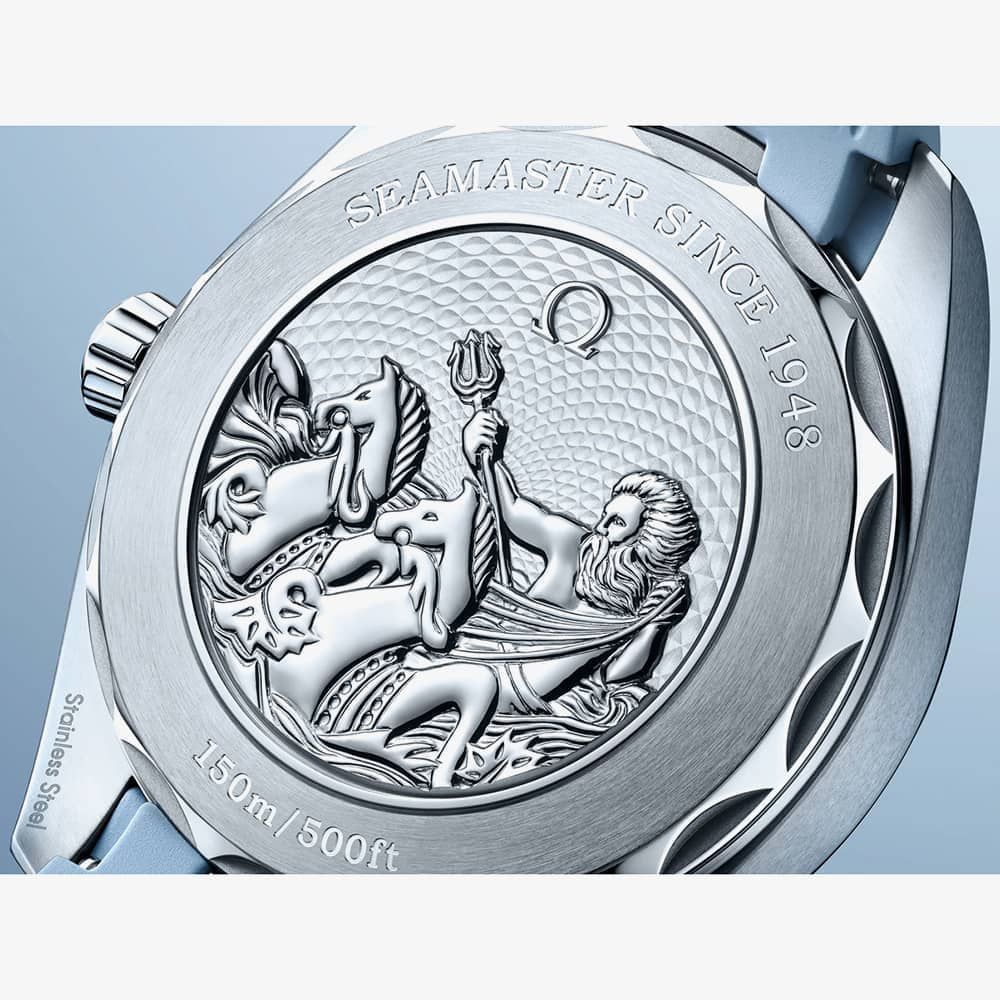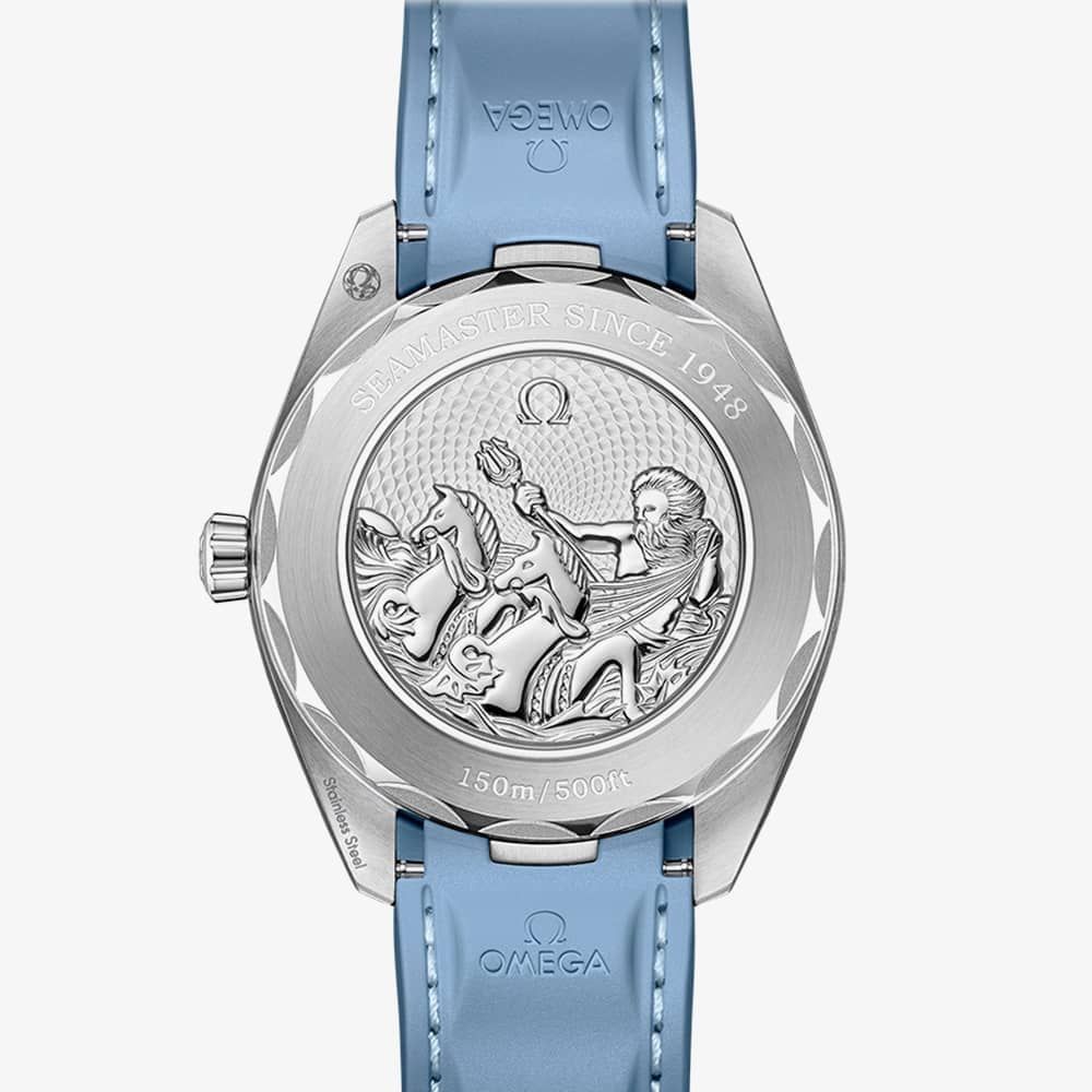 Featuring a polished and brushed stainless steel case, this 41 mm Aqua Terra watch exudes sophistication. The timepiece is accompanied by a blue rubber strap that seamlessly integrates into the case, enhanced with a solid polished link made of stainless steel. The dial showcases a teak pattern in OMEGA's signature Summer Blue shade. It undergoes a sun-brushed treatment, followed by PVD coating and varnishing with a gradient finish that reflects the watch's exceptional water resistance. Rhodium-plated hands and indexes, filled with a unique light blue Super-LumiNova, grace the dial, along with a matching blue date window indicator positioned at 6 o'clock. Flipping the watch over unveils a stamped commemorative Seamaster logo, featuring a trident-bearing Poseidon accompanied by two seahorses—a tribute to OMEGA's original design from 1956 and the brand's current emblem. Nestled behind this emblem is OMEGA's Co-Axial Master Chronometer calibre 8900, which has been certified at the industry's highest level by the Swiss Federal Institute of Metrology (METAS), ensuring exceptional precision and performance.