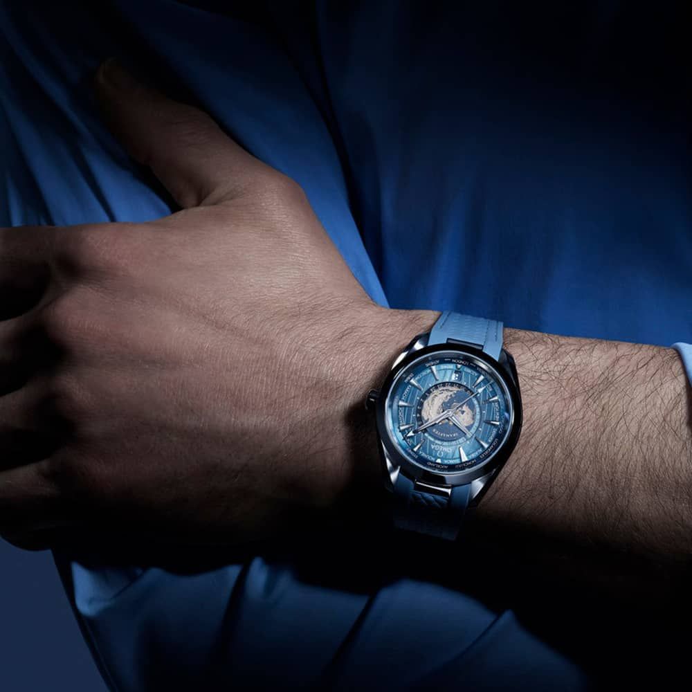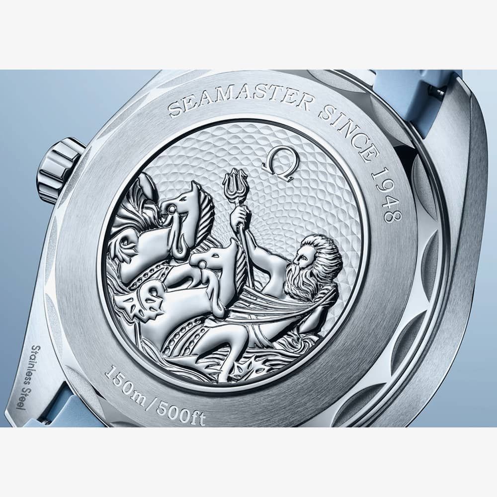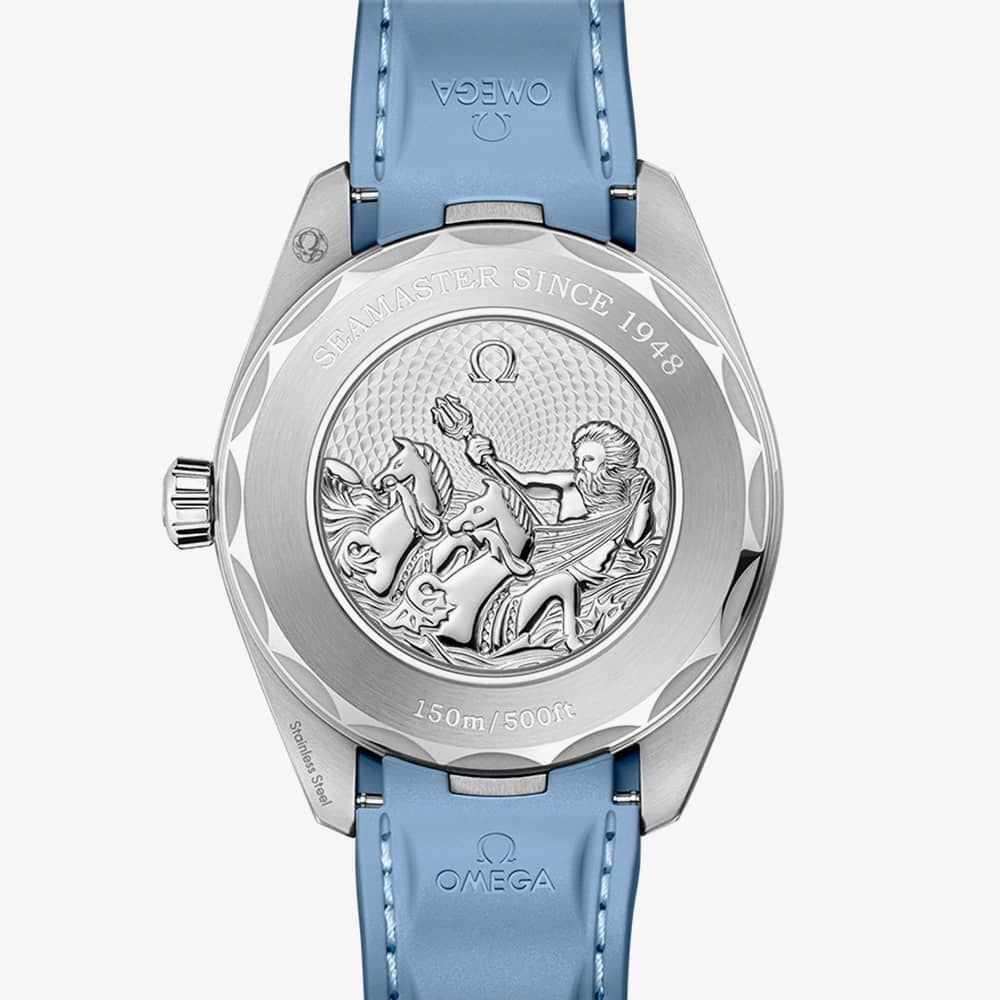 Featuring a polished and brushed stainless steel case, this 43 mm Worldtimer watch showcases a harmonious blend of elegance and durability. The timepiece is paired with a blue rubber strap, seamlessly integrated into the case and further enhanced with a solid polished link. The dial boasts a sun-brushed texture in OMEGA's distinctive Summer Blue hue, accentuated by a gradient finish that reflects the watch's impressive water resistance. Vertical teak stripes add a touch of sophistication, while rhodium-plated hands and indexes, filled with a unique light blue Super-LumiNova, provide enhanced legibility. Flipping the watch over unveils a stamped commemorative Seamaster logo, featuring a trident-bearing Poseidon accompanied by two seahorses—an homage to OMEGA's original design from 1956 and the brand's current emblem. Concealed behind this emblem is the Co-Axial Master Chronometer Calibre 8938, ensuring exceptional timekeeping precision.