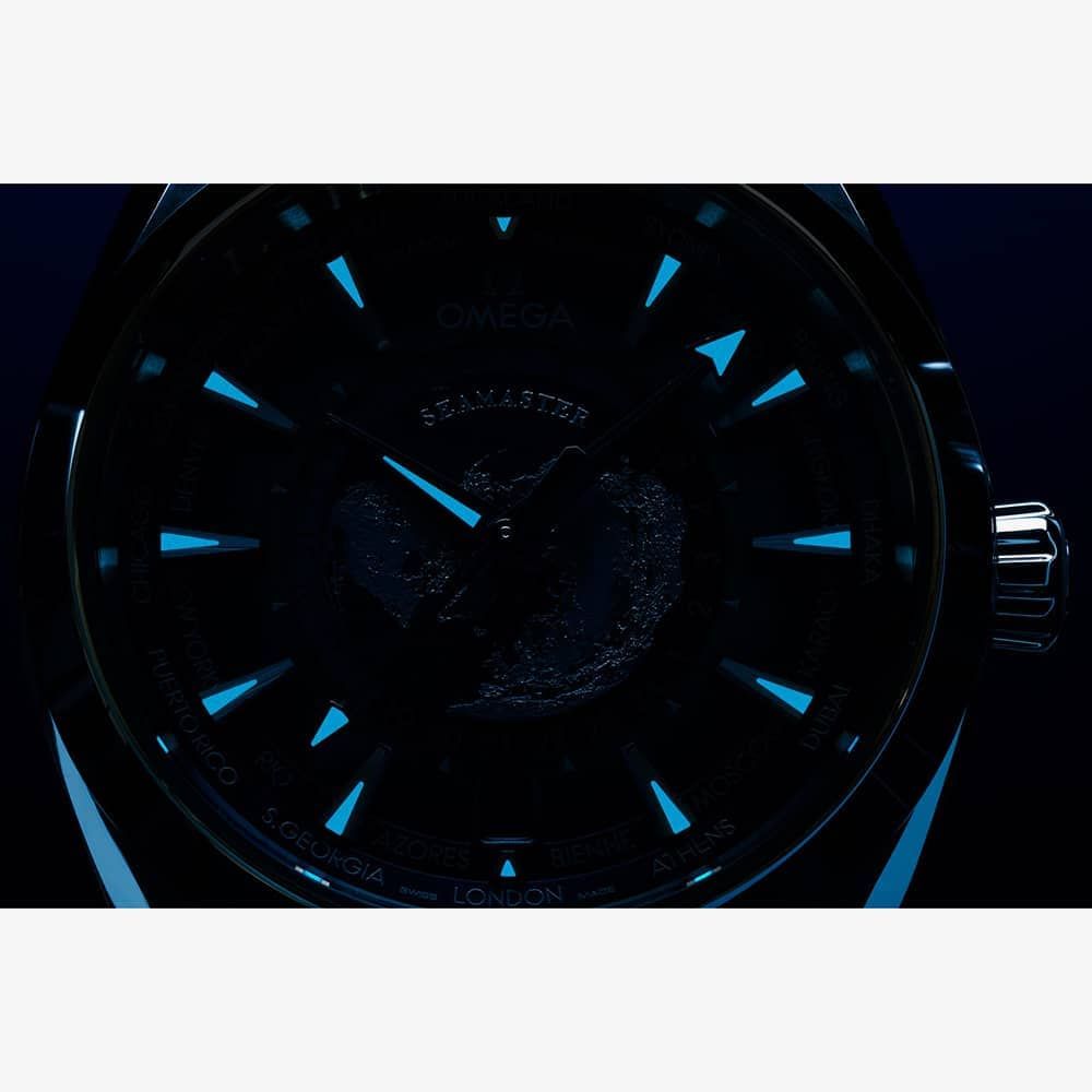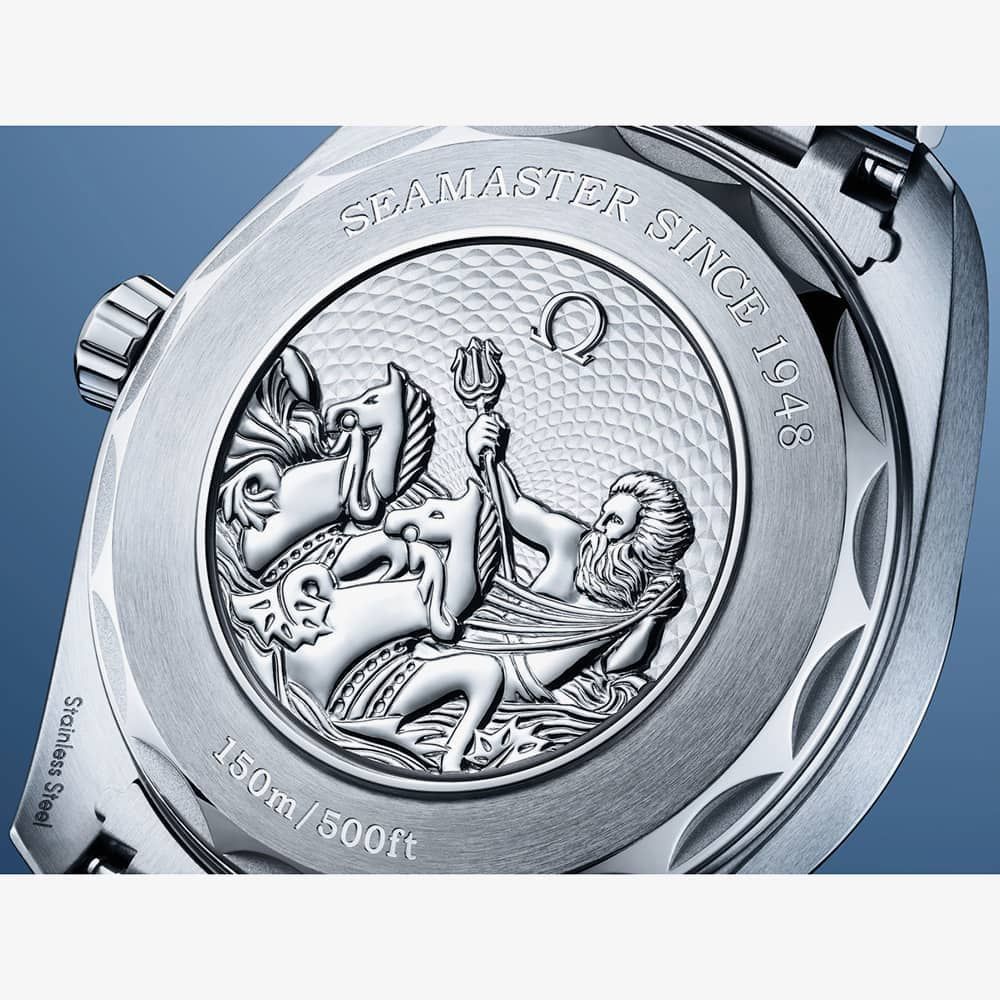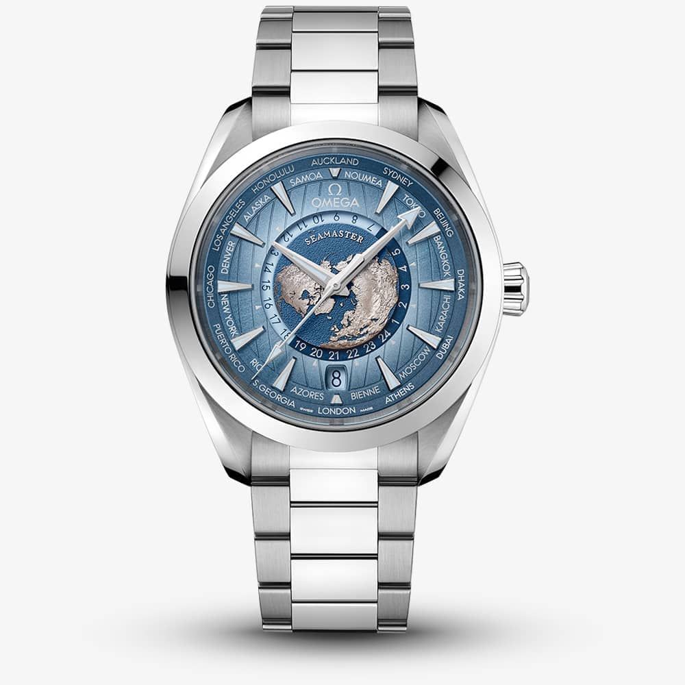 This 43 mm Worldtimer, with its case in polished and brushed stainless steel, has a matching bracelet. The dial is sun-brushed in OMEGA’s own Summer Blue with a gradient finish to reflect the watch’s level of water resistance and includes vertical teak stripes and rhodium-plated hands and indexes filled with a unique light blue Super-LumiNova. Around the dial is a circle of silvery printed global destinations. The centre contains a 24-hour glass ring, with light blue to indicate daytime and dark blue to indicate night. The vision of Earth, which depicts a blue ocean and relief of the continents, is laser-ablated on a grade 5 titanium plate. Turning the watch over reveals a stamped commemorative Seamaster logo depicting a trident-bearing Poseidon and two seahorses: OMEGA’s 1956 original and the brand’s current design. Behind which sits the Co-Axial Master Chronometer Calibre 8938.