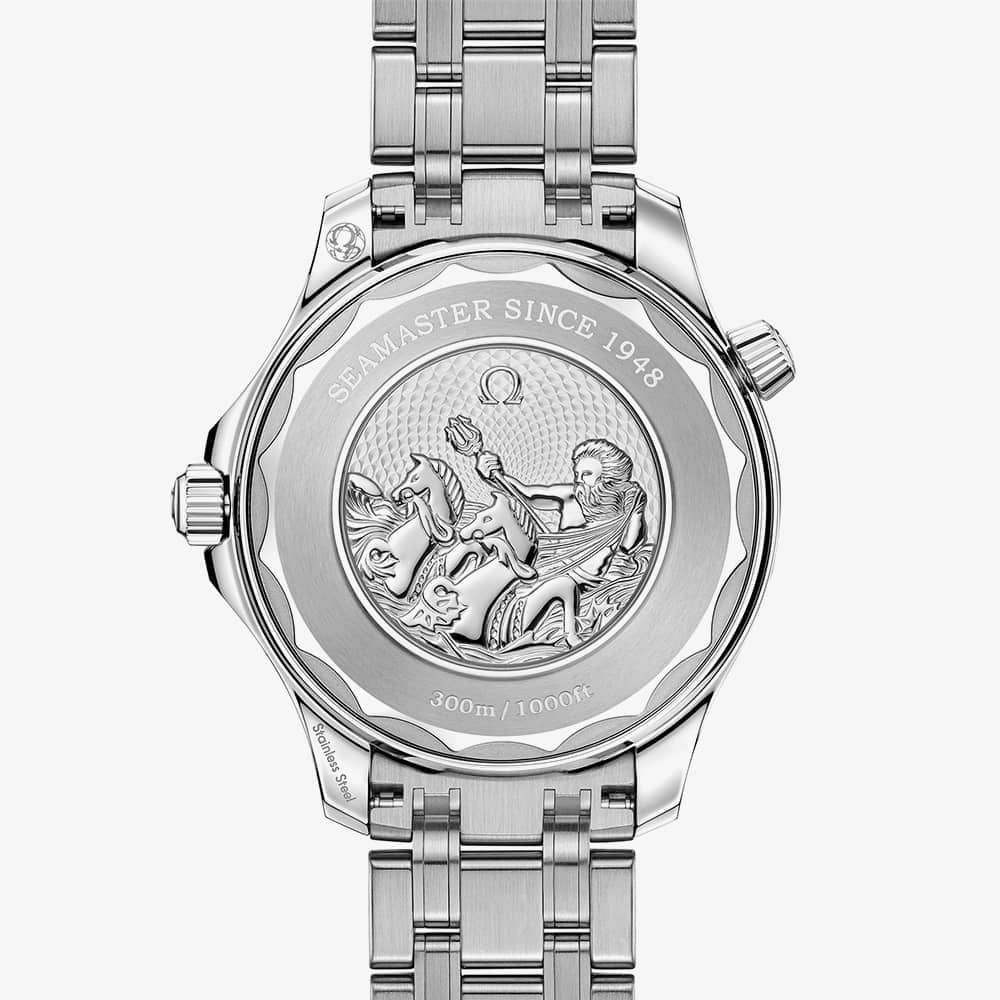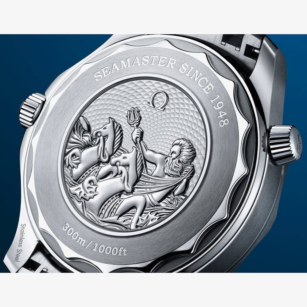 Flipping the watch over reveals a commemorative Seamaster logo with a trident-bearing Poseidon and two seahorses, representing OMEGA's original design from 1956 and its current iteration. Behind this emblem lies OMEGA's Co-Axial Master Chronometer calibre 8800, which has been certified at the highest level by the Swiss Federal Institute of Metrology.