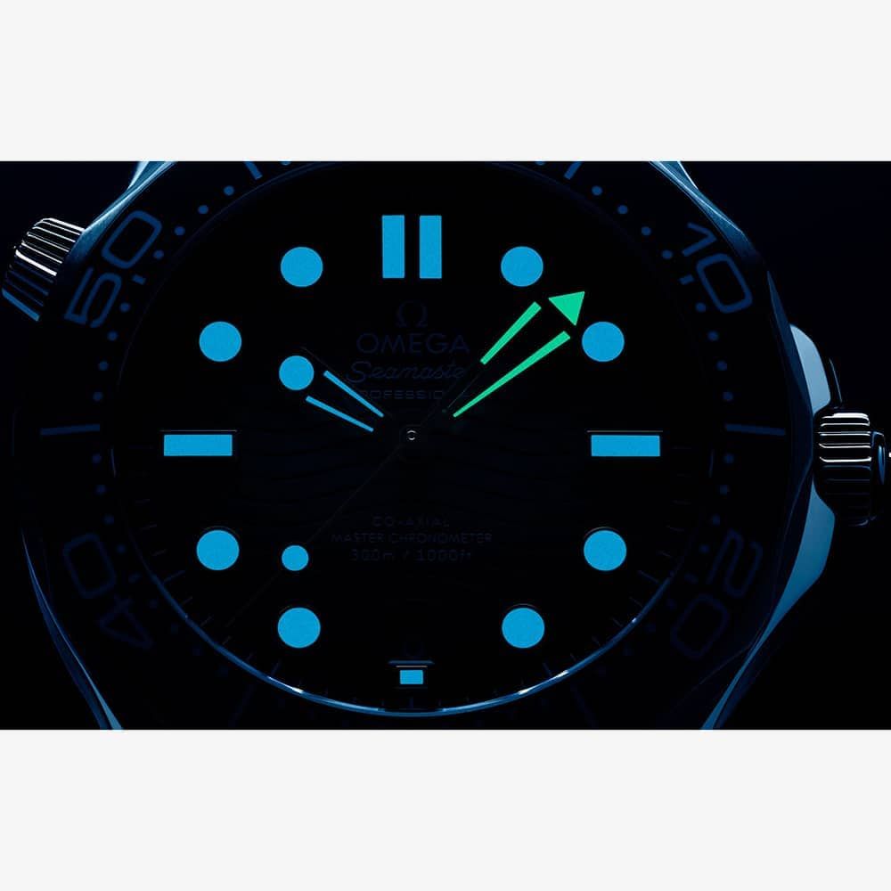 This Seamaster Diver 300M, with a diameter of 42 mm, features a stainless-steel case and bracelet. The dial, made of ceramic, showcases OMEGA's exclusive Summer Blue shade and undergoes a PVD treatment, resulting in a gradient finish that represents the watch's water resistance. The iconic wave pattern of the 300M is also present.