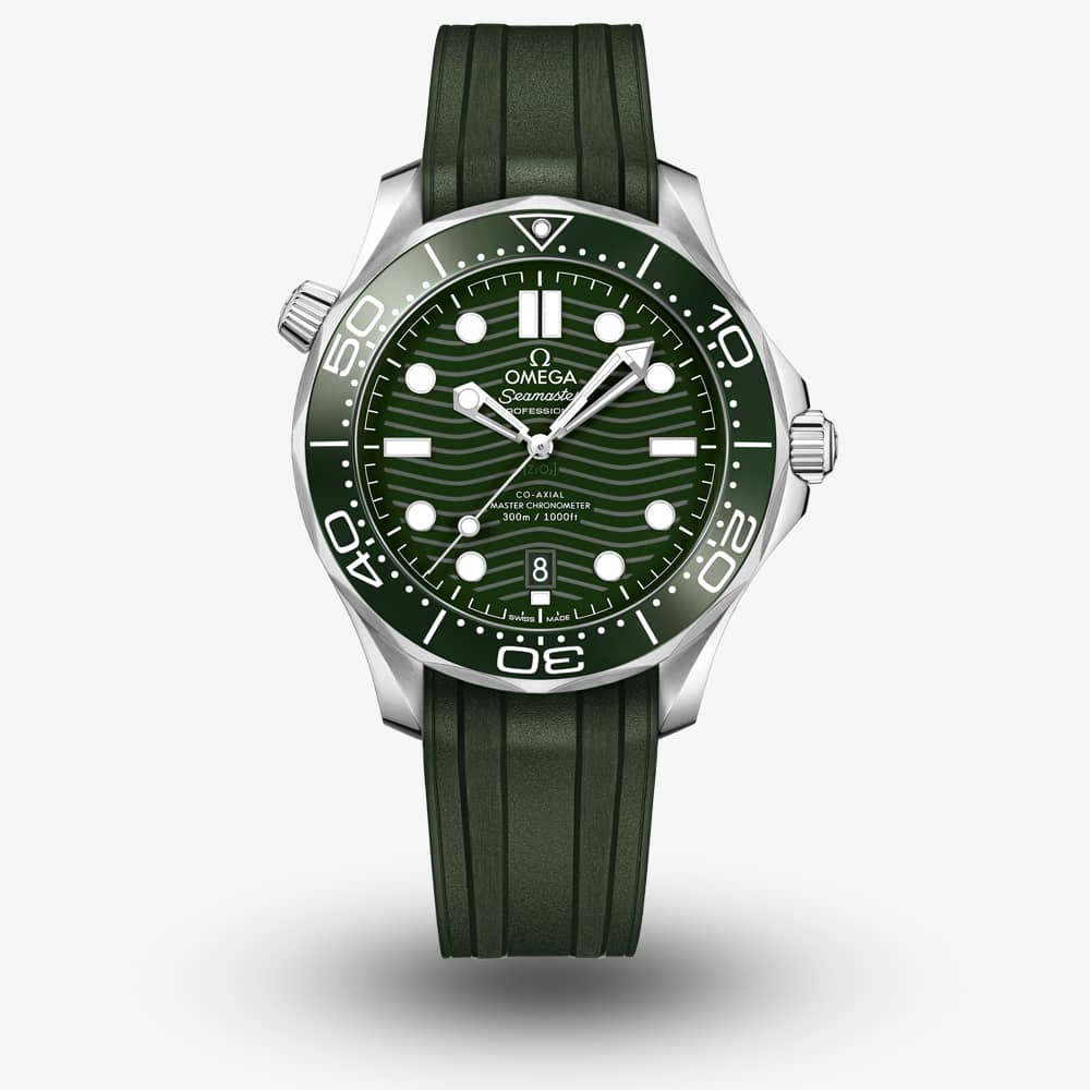 The OMEGA Seamaster Divers Green Chronometer Watch 210.32.42.20.10.001 combines a 42mm round-shaped stainless steel case and green rubber strap with a buckle clasp. The skeleton hands and raised indexes are rhodium-plated, filled with white Super-LumiNova, and protected beneath domed scratch resistant sapphire crystal glass with an anti-reflective treatment on both sides. It has a unidirectional rotating polished green ceramic bezel with a white enamel diving scale and the helium escape valve has also been given a conical design.