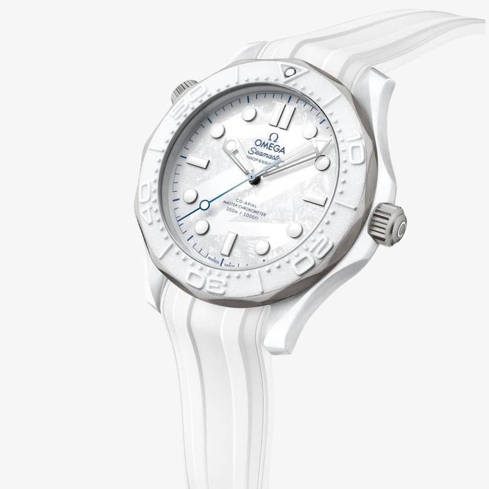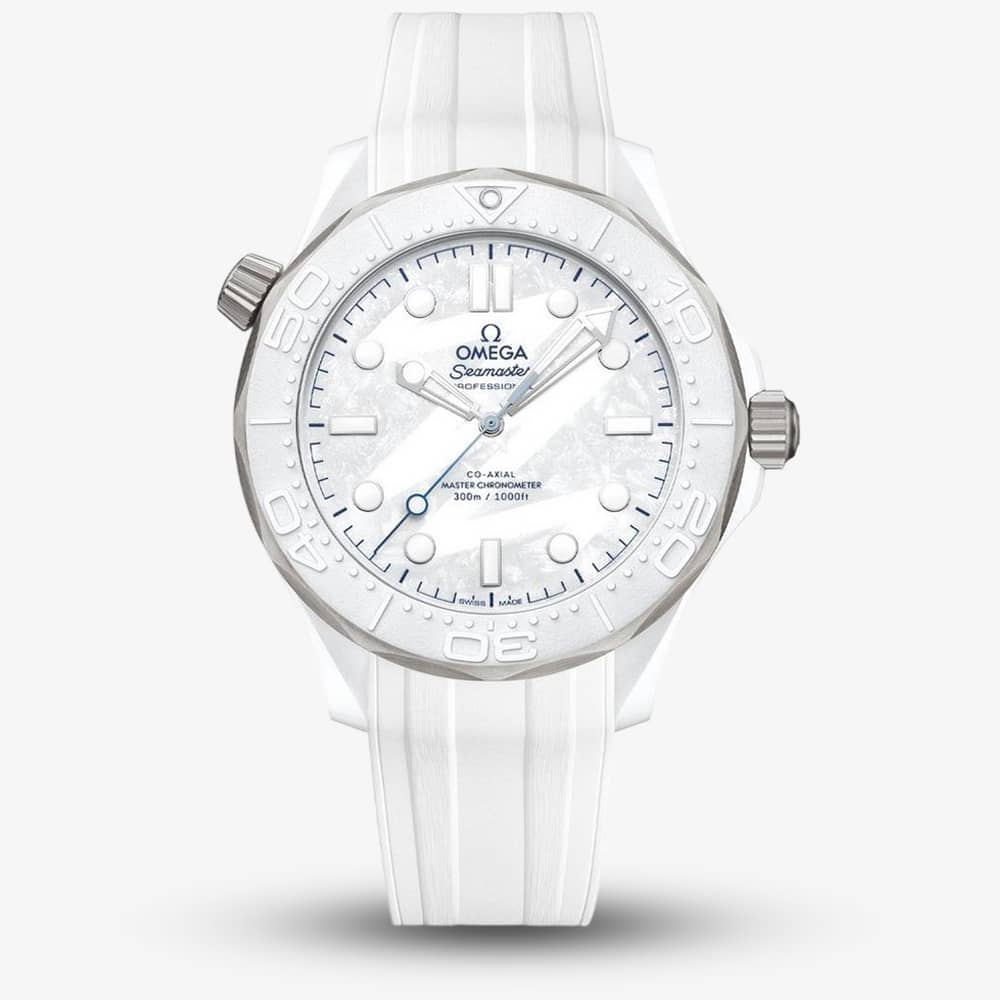 Crafted with a bold 43.5 mm case, the watch features a crisp white dial that delivers exceptional legibility and a fresh, contemporary aesthetic. The dial is complemented by refined detailing and luminous hands and markers, ensuring optimal visibility in both daylight and low-light conditions. The unidirectional rotating bezel enhances functionality, while the watch’s impressive 300-metre water resistance underscores its professional-grade performance. The sporty white rubber strap offers exceptional comfort and durability, perfectly balancing the watch’s technical capability with a modern, athletic look.