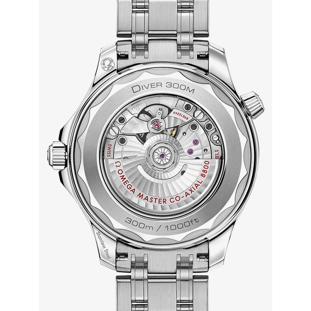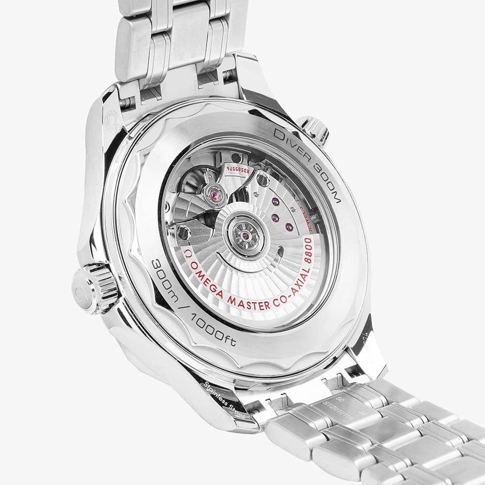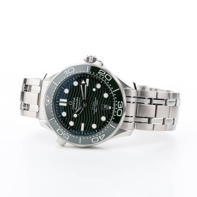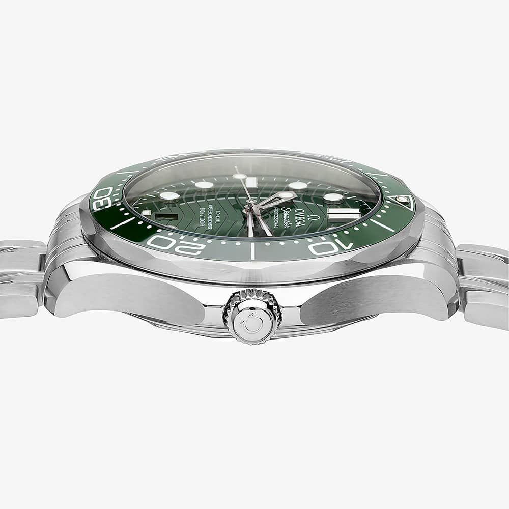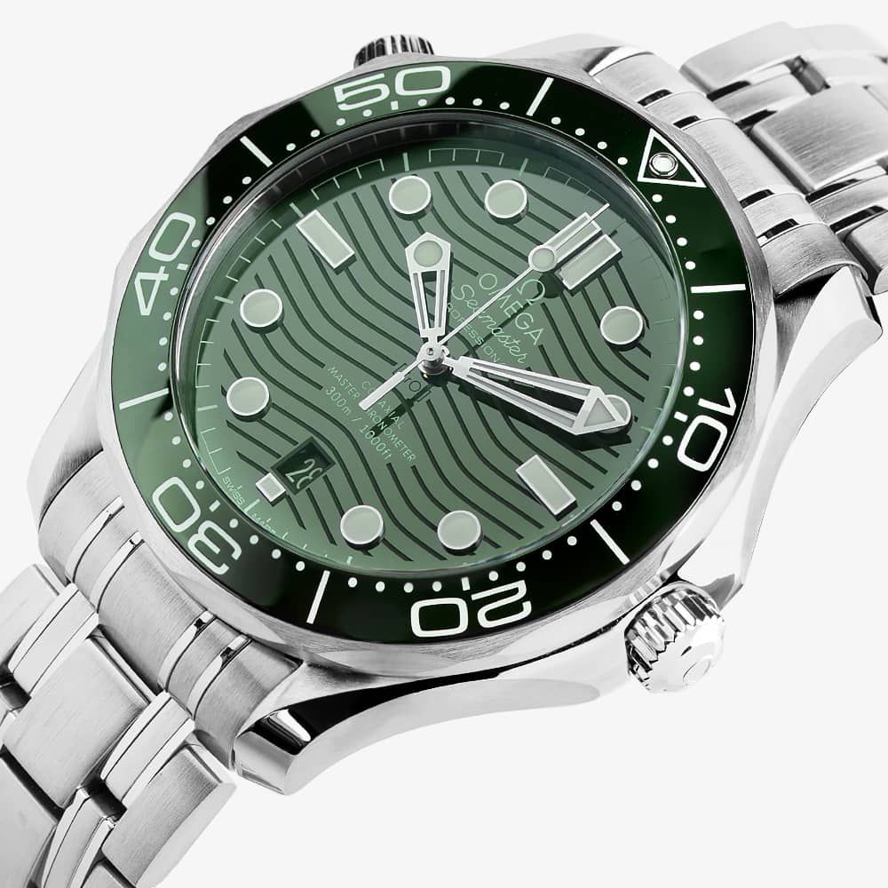OMEGA Men’s Seamaster Diver Co-Axial Master Watch 210.30.42.20.10.001 combines a 42mm round-shaped stainless-steel case and silver stainless steel bracelet with a push-button deployment clasp with a diver’s extension. This stylish Seamaster features a polished green ceramic analogue dial featuring laser-engraved waves with the date visible at position six. The skeleton hands and raised indexes are rhodium-plated, filled with white Super-LumiNova, and protected beneath domed scratch resistant sapphire crystal glass with an anti-reflective treatment on both sides. It has a unidirectional rotating polished green ceramic bezel with a white enamel diving scale and the helium escape valve has also been given a conical design. Power is generated by the OMEGA Master Chronometer Calibre 8800 automatic movement with an approximate power reserve of 55 hours, which can be seen through the sapphire crystal case back. This model also has a water resistance of up to 300 metres, a lug width of 20mm, and weighs 198 grams.
