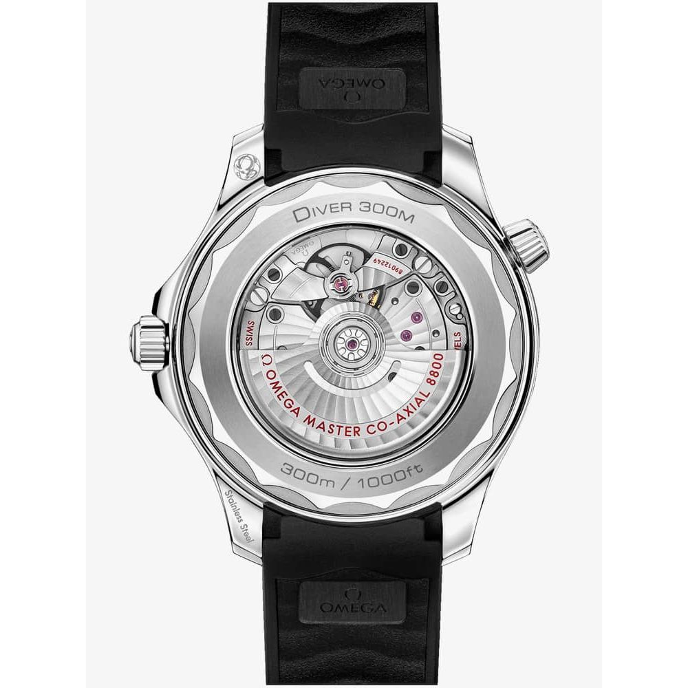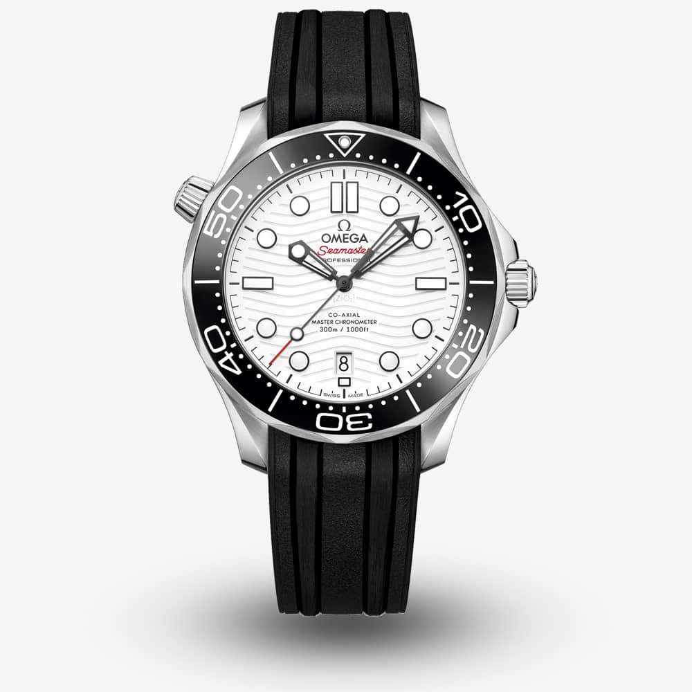 The OMEGA 210.32.42.20.04.001 Seamaster Diver watch combines a 42mm round shaped stainless steel case and black rubber strap with a traditional buckle. It has a white wave patterned analogue dial with a date display and blackened Super-LumiNova filled hands and hour markers, all of which is protected beneath domed scratch resistant sapphire crystal glass with an anti-reflective treatment on both sides. Power is generated by the Master Chronometer Calibre 8800 automatic movement with 35 jewels and a 55 hour power reserve. This model also has a sapphire crystal case back, a helium escape valve for decompression purposes after diving, a unidirectional rotating bezel, and a water resistance of up to 300 metres.