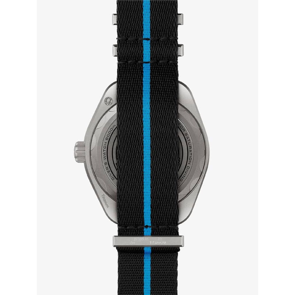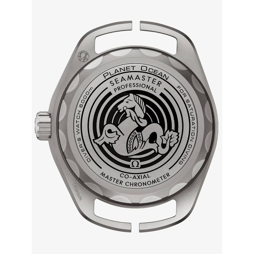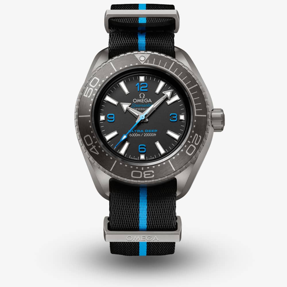 The OMEGA Seamaster Planet Ocean Titanium Chronometer Watch 215.92.46.21.01.001 combines a 46mm round-shaped sand-blasted Grade 5 Titanium featuring a brushed black ceramic bezel with its diving scale in Liquidmetal. The watch is set on a striped black and cyan polyamide NATO fabric strap with a titanium loop and traditional buckle. It has a black ceramic grade 5 titanium analogue dial with 18K white gold hands and indexes coated in luminescent Super-LumiNova, protected beneath domed, protuberant scratch-resistant sapphire crystal glass with anti-reflective treatment on both sides. Power is generated by the self-winding automatic movement with Co-axial escapements, with an approximate power reserve of 60 hours. Certified Master Chronometer, approved by METAS, resistant to magnetic fields reaching 15,000 gausses. This model also has a water resistance of up to 6000 metres.
