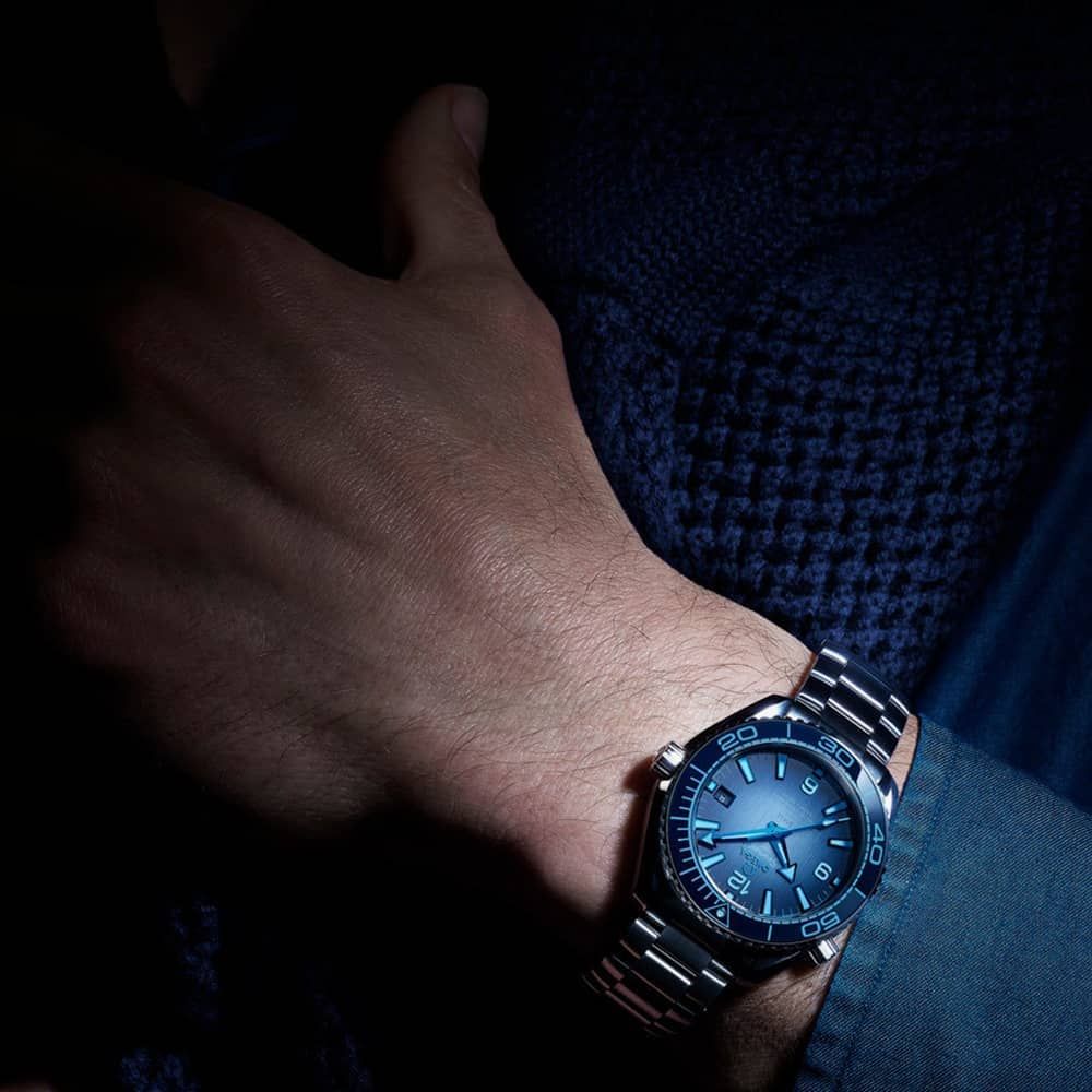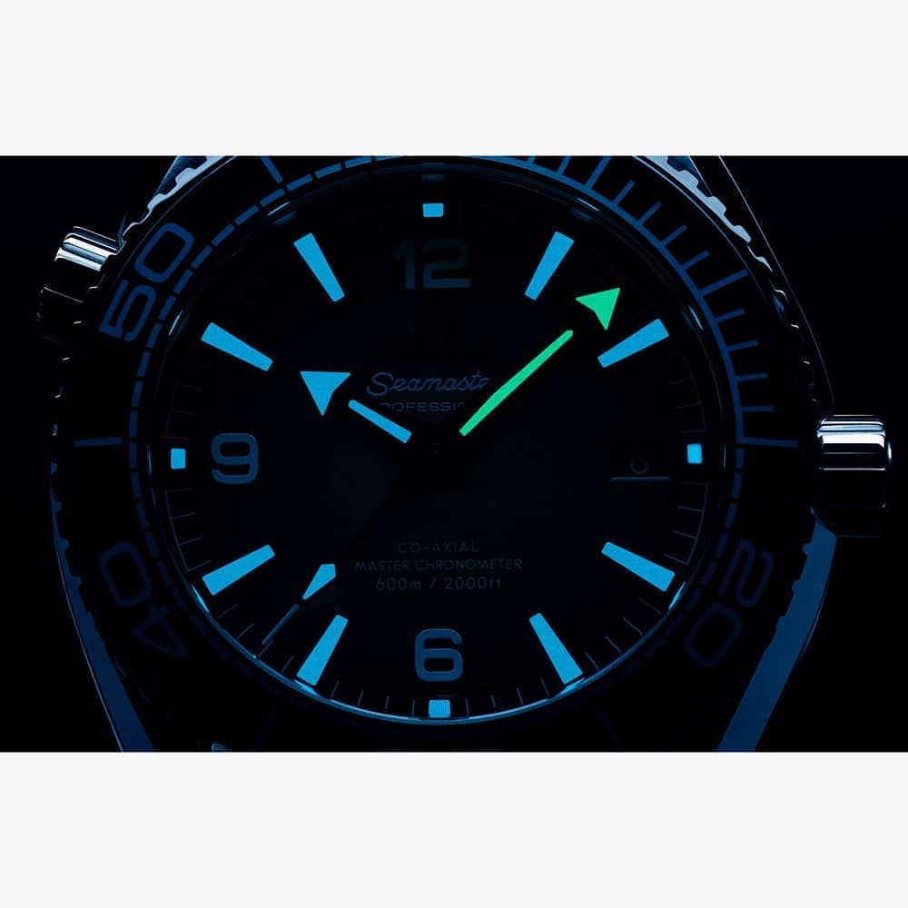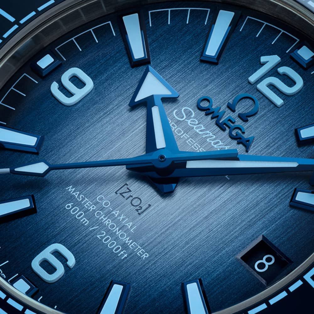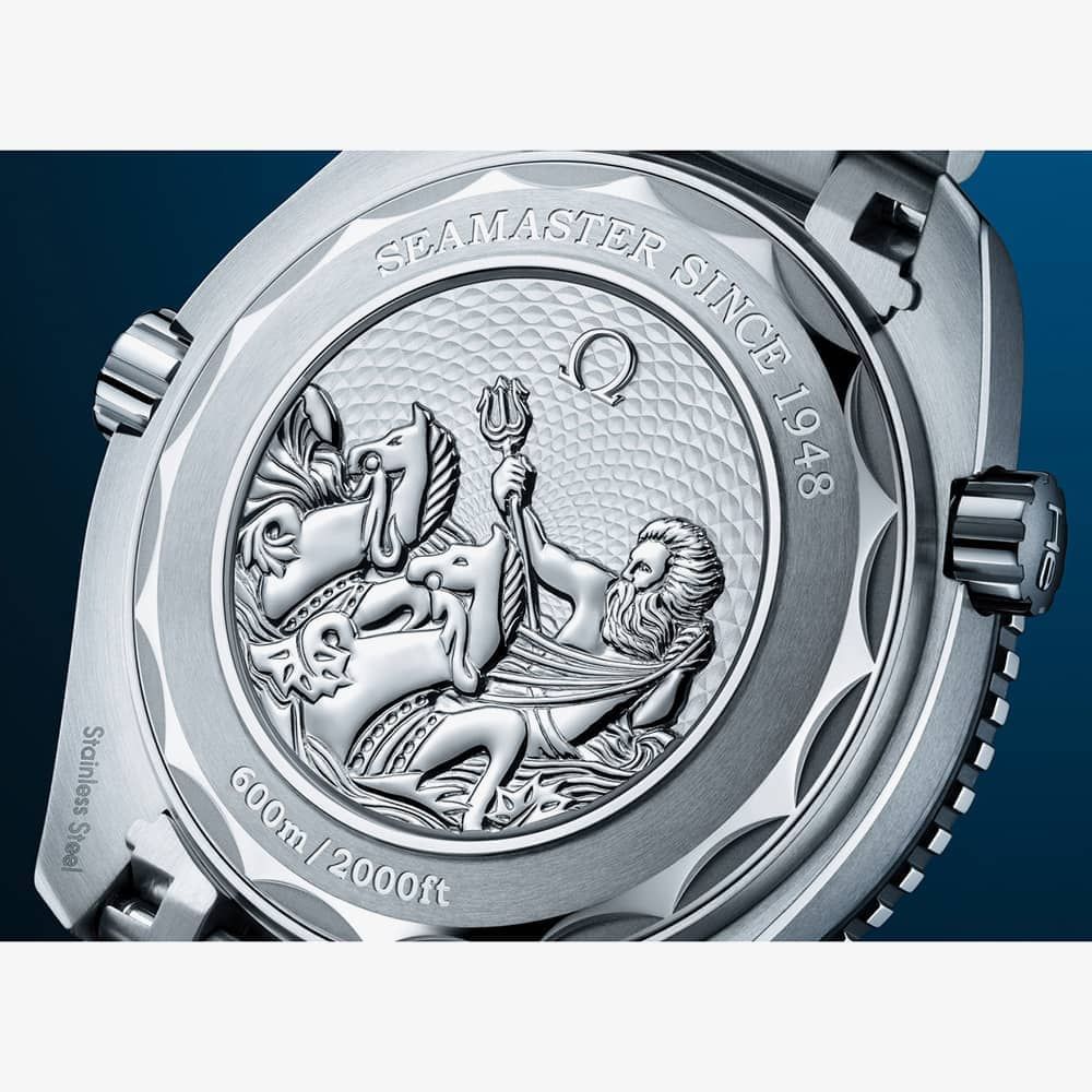 Featuring a stainless-steel case and bracelet, this 39.5 mm Planet Ocean 600M watch exudes robustness and style. The dial showcases a vertical brushed ceramic design in OMEGA's unique Summer Blue shade, which undergoes PVD treatment and varnishing with a gradient finish that represents the watch's exceptional water resistance. Encircling the dial is a blue ceramic bezel adorned with a light blue diving scale. The display itself boasts blued hands and indexes filled with a distinctive light blue Super-LumiNova. Flipping the watch reveals a stamped commemorative Seamaster logo portraying a trident-bearing Poseidon alongside two seahorses—a tribute to OMEGA's original design from 1956 and its current emblem. Beneath this emblem lies the OMEGA Co-Axial Master Chronometer calibre 8900. As the name implies, the Seamaster Planet Ocean 600M is built to withstand water pressure up to 600 meters, and it features an essential helium-escape valve.