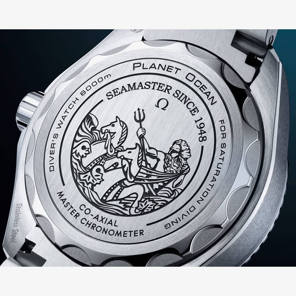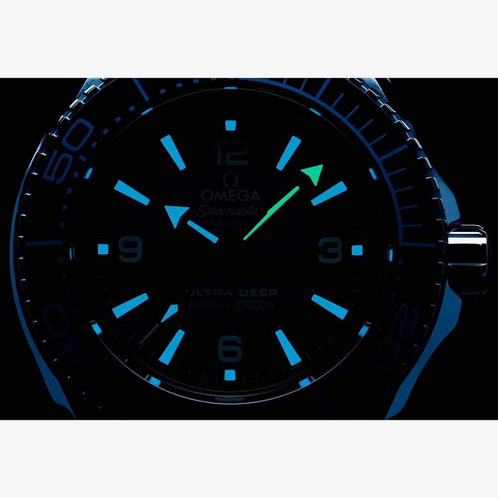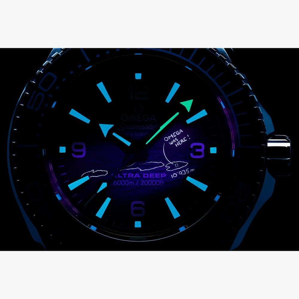 The Ultra Deep concept watch, which achieved a historic milestone by reaching the deepest point on Earth during the Five Deeps Expedition in 2019, now inspires a collection for adventurous individuals. Tested in real ocean conditions during its development, this timepiece boasts an impressive water resistance of 6,000 meters (20,000 ft.), meeting the ISO 6425:2018 standard for saturation divers' watches as certified by the Swiss Federal Institute of Metrology (METAS). Measuring 45.5 mm, this model showcases a robust O-MEGASTEEL case and bracelet. Its extraordinary dial pays tribute to the enigmatic depths of the ocean. The intricate pattern accurately replicates the bottom of the Challenger Deep in the Mariana Trench, meticulously mapped by the Five Deeps team using nearly one million sonar points. The dial's lacquered finish, created by allowing a flow of lacquer to gracefully spread across the surface, creates a mesmerizing sense of depth. Moreover, when exposed to UV light, the dial unveils a playful surprise—the words "OMEGA WAS HERE"—pointing towards the record-breaking dive depth of 10,935 meters (35,876 ft.) and showcasing the Western, Central, and Eastern Pools. The caseback bears a laser-engraved commemorative Seamaster logo, featuring a trident-bearing Poseidon accompanied by two seahorses: OMEGA's original design from 1956 and the brand's current emblem. Within the caseback resides the OMEGA Co-Axial Master Chronometer calibre 8912, exemplifying the brand's commitment to precision and craftsmanship.