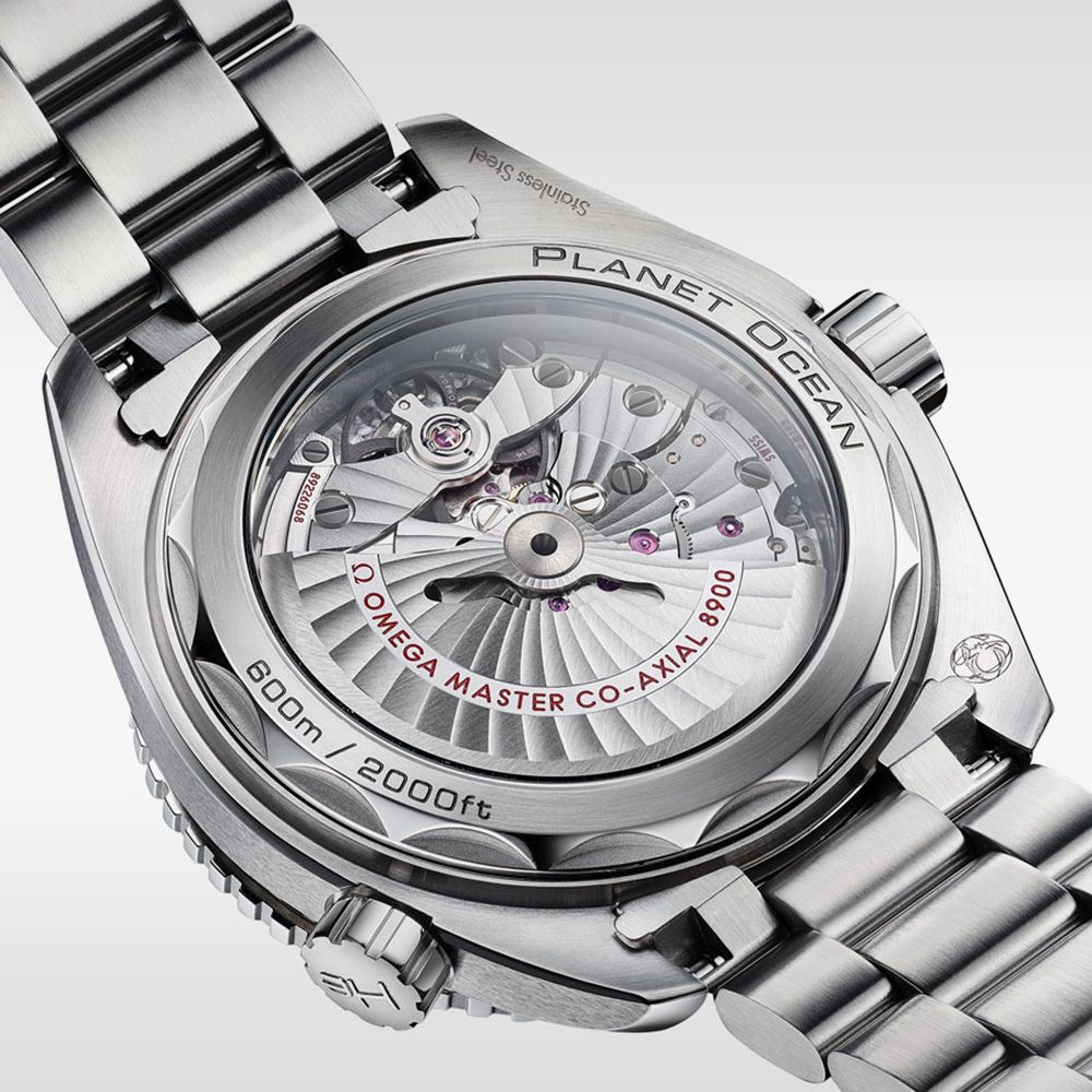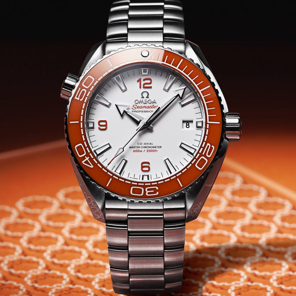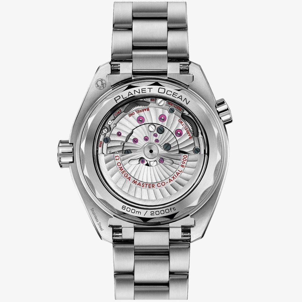 The OMEGA 215.30.44.21.04.001 Seamaster Planet Ocean watch combines a 44mm round-shaped stainless steel case with an orange ceramic unidirectional bezel that feautres super luminova and a silver stainless steel bracelet with a fold-over clasp. It has a white ceramic analogue dial with Super-LumiNova luminescent hands, with the date visible at position three- protected beneath domed scratch‑resistant sapphire crystal with anti‑reflective treatment on both sides. Power is generated by the OMEGA Master Chronometer calibre 8900 automatic movement, with an approximate power reserve of 60 hours and can be seen through the sapphire crystal case back. This model also has a water resistance of up to 600 metres.
