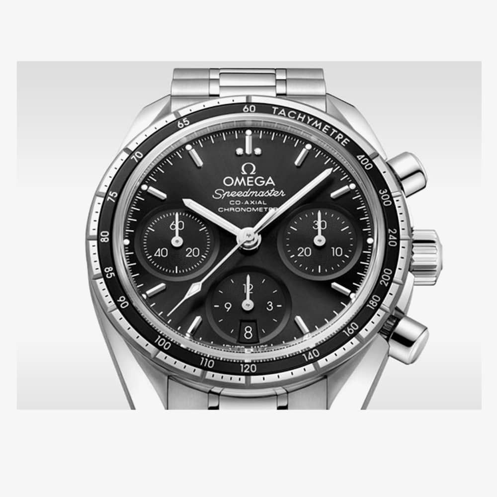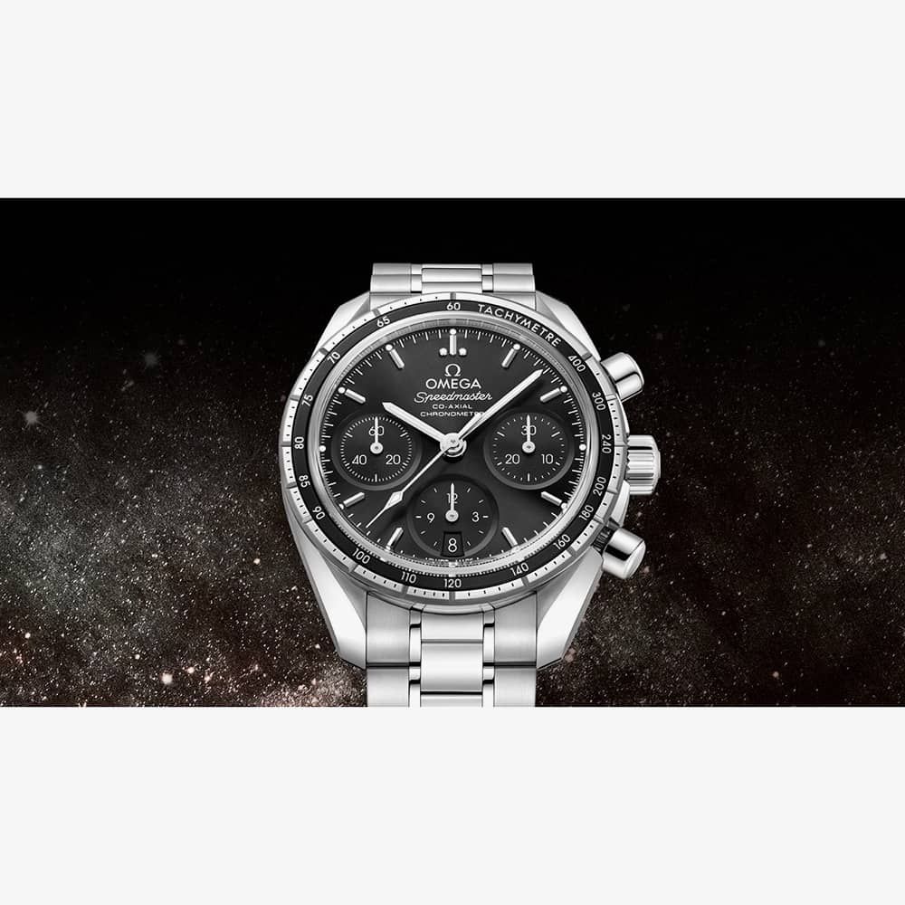 The OMEGA 324.30.38.50.01.001 Speedmaster watch combines a 38mm round shaped stainless steel case and bracelet with a push button clasp. It has a black analogue dial with rhodium plated Super-LumiNova filled hands, chronograph sub-dials, and a date display, all of which is protected beneath scratch resistant sapphire crystal glass with an anti-reflective treatment on both sides. Power is generated by the Master Chronometer Calibre 3330 automatic movement with 27 jewels and a 54 hour power reserve. This model also has a tachymeter scale on the bezel and a water resistance of up to 100 metres.