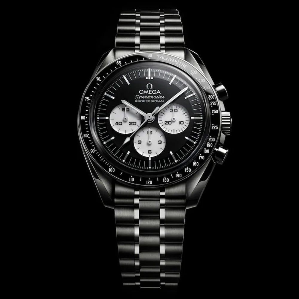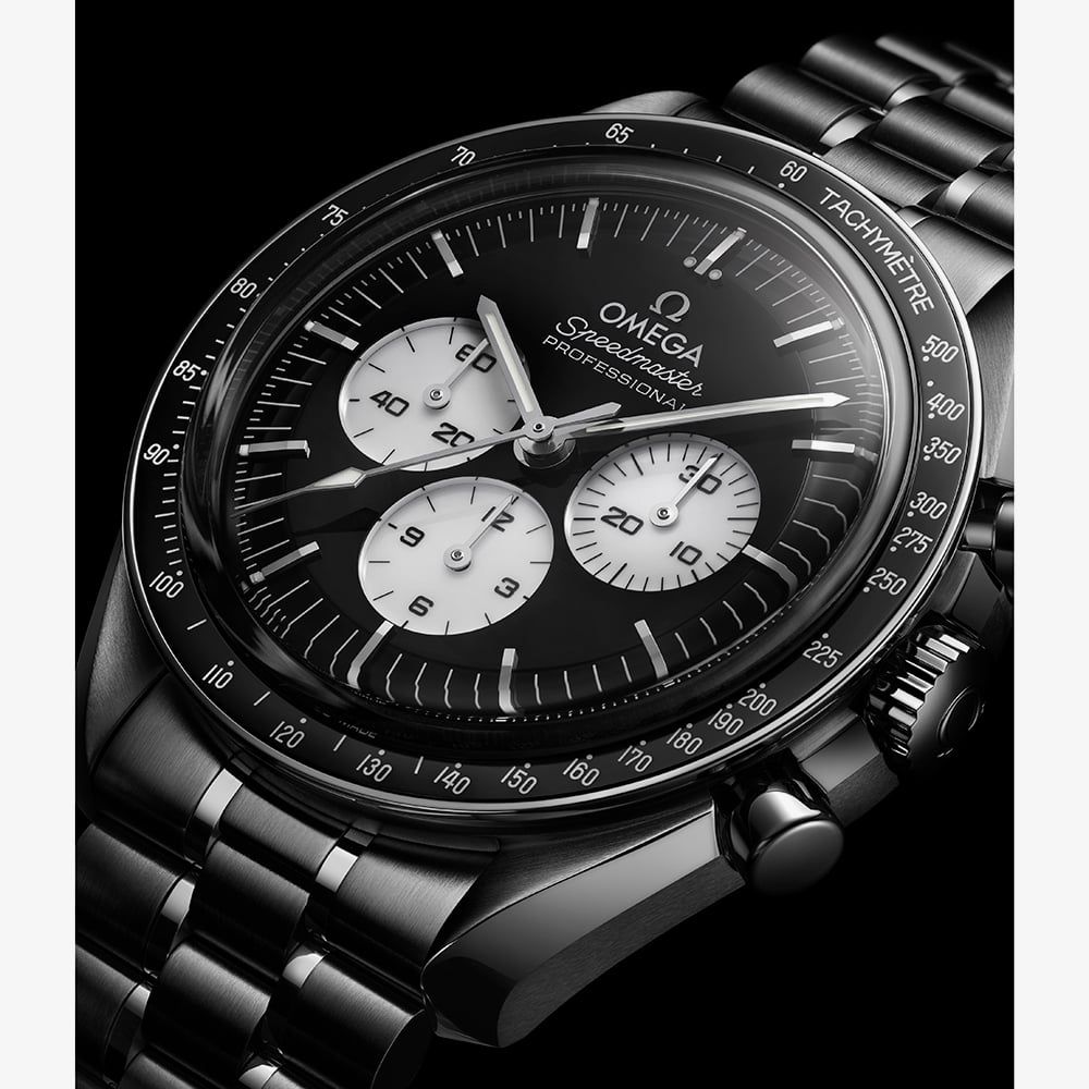 An icon of modern watchmaking, the OMEGA Speedmaster Moonwatch remains closely linked to humanity’s greatest exploration milestones. Reference 310.30.42.50.01.004 takes its design cues from the fourth generation Speedmaster worn on the moon, presented in a 42mm stainless steel case with a balanced, purposeful feel on the wrist. The black stepped dial is rich and glossy, with white sub-dials set into rhodium plated surrounds for crisp contrast. Sapphire crystal on both the front and case back offers clarity and a refined sense of depth, while the black ceramic bezel with its dot over 90 adds a familiar detail cherished by collectors.