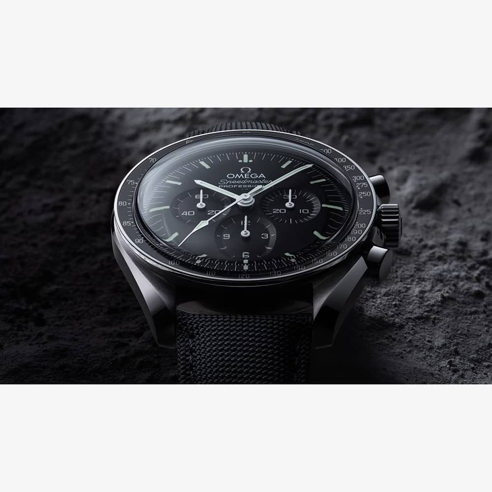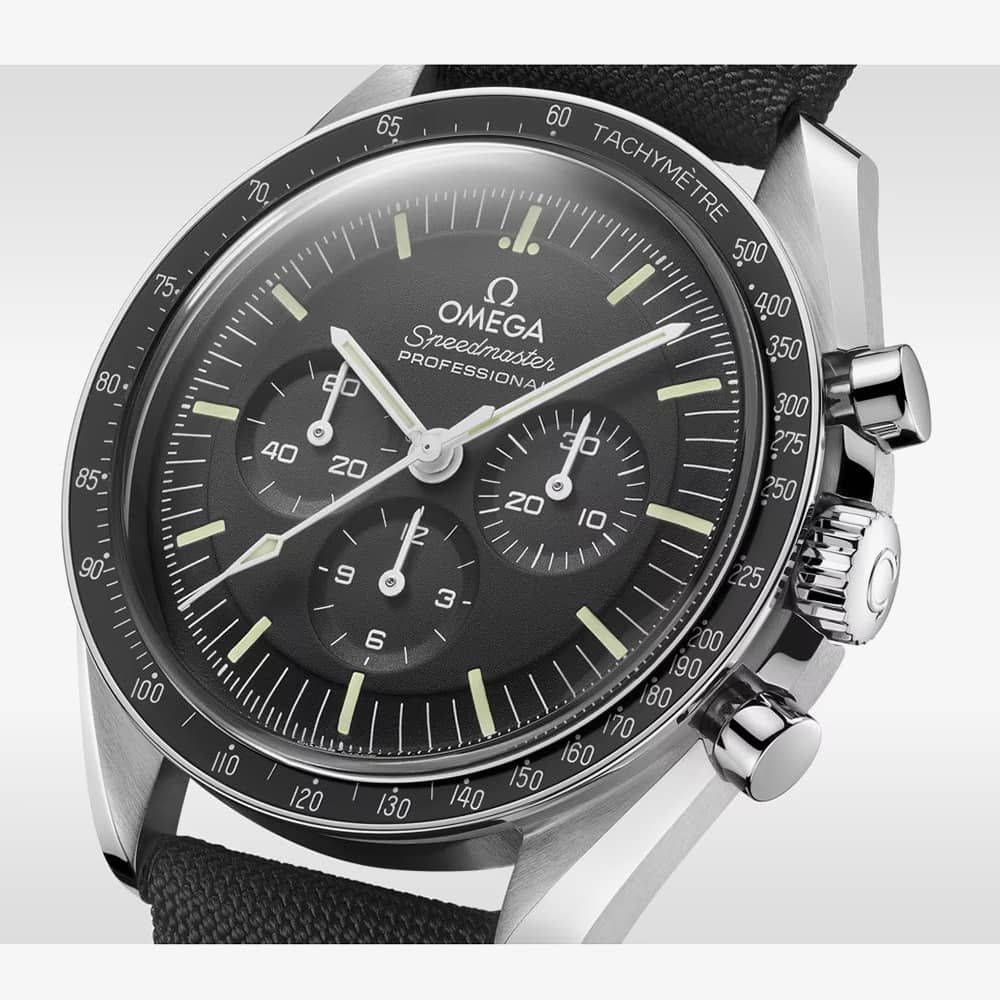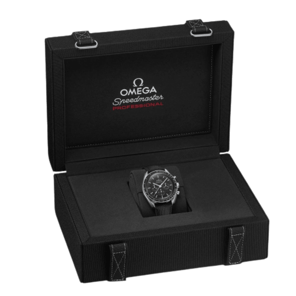 • Presented on a black nylon strap with polished clasp and OMEGA logo on a satin-finished cover.