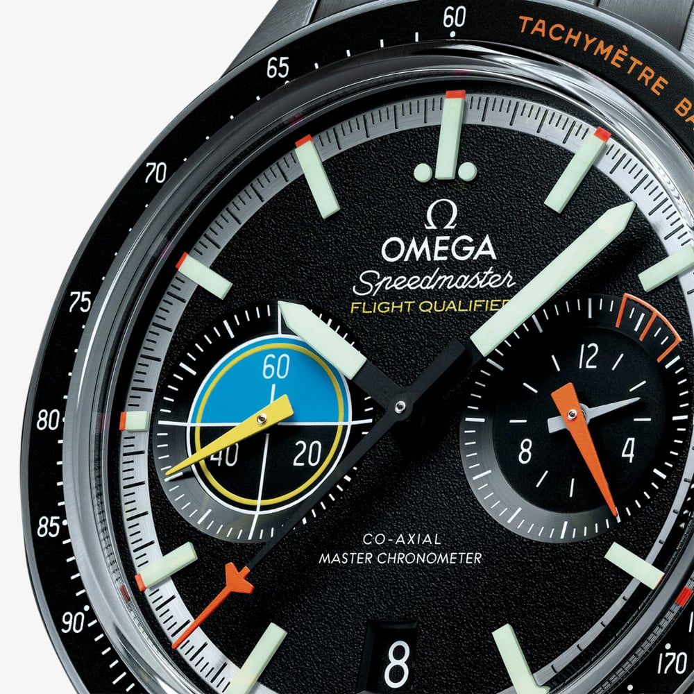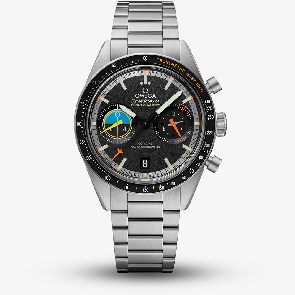 Inspired by the 1957 original, the OMEGA Speedmaster Pilot celebrates the brand’s legacy in space and aviation. The 40.85 mm brushed stainless steel case houses a matte black dial with rhodium accents and green-glowing Super-LumiNova markers. Cockpit-style subdials include a “burn rate” recorder at 3 o’clock with an orange hand, and a target-inspired small seconds at 9 o’clock. Powered by the Co-Axial Master Chronometer Calibre 9900, this watch is complete with an alternative NATO strap, strap changing tool and a special travel pouch.