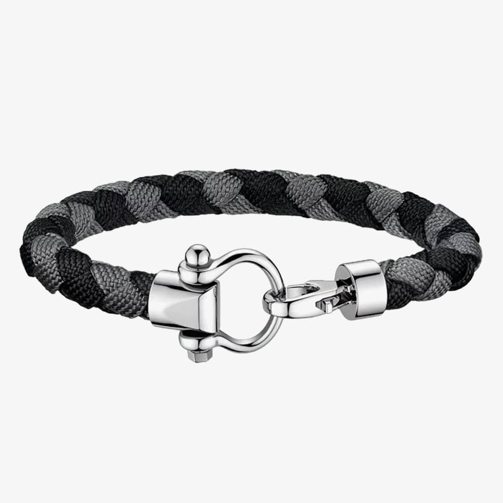 This stunning bracelet showcases a black and grey braided nylon rope-style strap, expertly completed with a stainless-steel clasp for a luxury touch. Drawing from the brand's DNA, they are an integral element of the OMEGA universe.