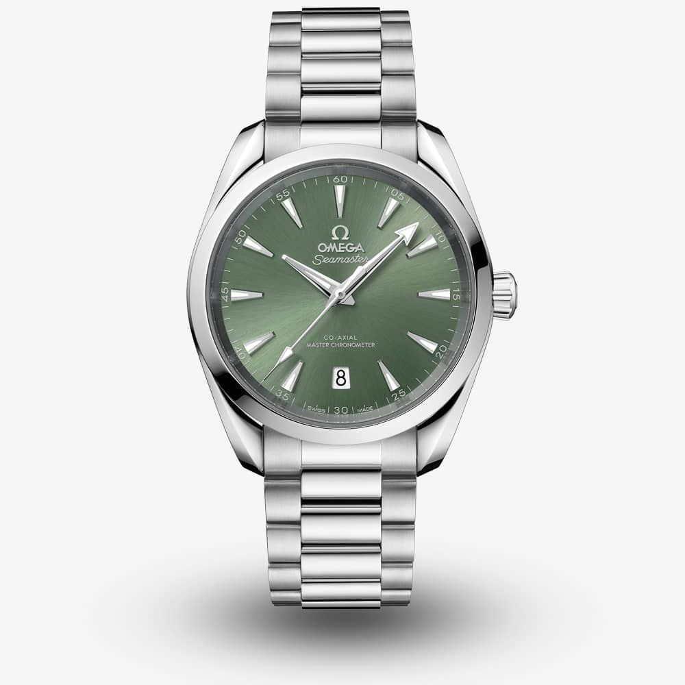 The OMEGA Seamaster Aqua Terra Co-Axial Master Chronometer 220.10.38.20.10.002 watch combines a 38mm round shaped stainless-steel case and a polished & brushed stainless-steel bracelet with a push button deployment clasp. It has a sun-brushed bay green analogue dial with Super-LumiNova hands & date display at the 6oclock position which are protected beneath a scratch-resistant domed sapphire crystal glass with an anti-reflective treatment on both sides. Power is generated by the automatic movement with a power reserve of up to 55 hours, a Co-Axial escapement & a Certified Master Chronometer. This OMEGA watch is Anti-Magnetic, has a screw-in-crown & transparent case back. This model also has a water resistance of up to 150 metres.