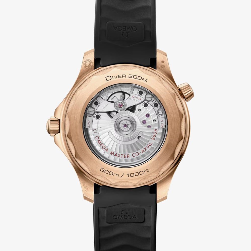 A statement in refined craftsmanship, this Seamaster is forged from Omega’s exclusive Bronze Gold, radiating a warm, sophisticated glow. The deep burgundy anodized aluminium bezel surrounds a sandblasted black dial, highlighted by hands and indexes filled with Super-LumiNova for exceptional legibility in any light. Powered by the Co-Axial Master Chronometer Calibre 8806 and revealed through a sapphire crystal case back, it combines cutting-edge precision with enduring elegance. Finished with a sleek black rubber strap, this is luxury built for depth.