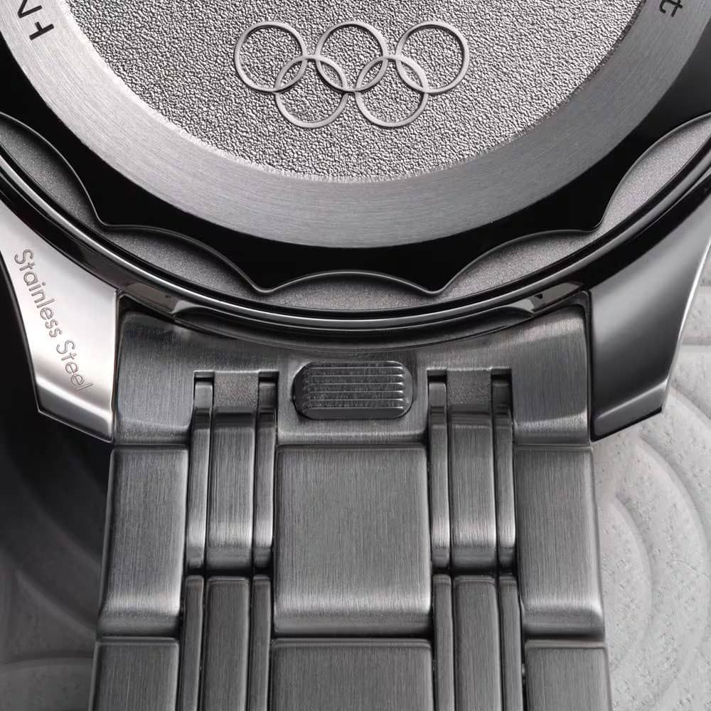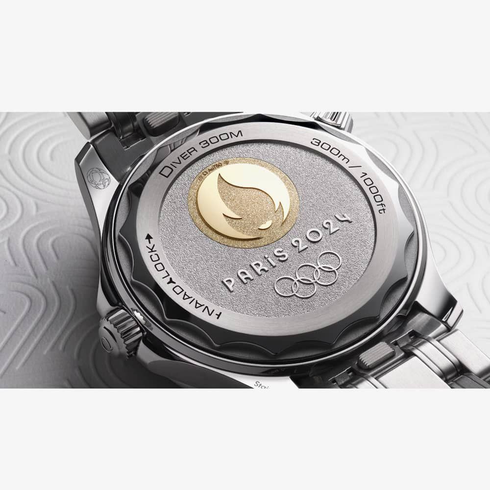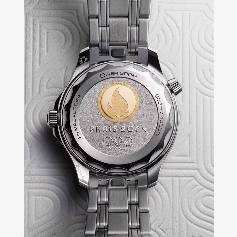 Turn the watch over, and a commemorative exhibition on the stainless steel case back becomes visible. OMEGA's patented NAIAD LOCK keeps everything secure. A captivating centrepiece takes centre stage: a medallion crafted from 18ct Moonshine Gold. Its Paris 2024 logo shines with a mirror polish, contrasting with a frosted background. The inscription "Paris 2024" and the iconic Olympic Rings join the celebration, also mirror-polished and set against the frosted surface for a truly dynamic effect, delivered in a special presentation box.