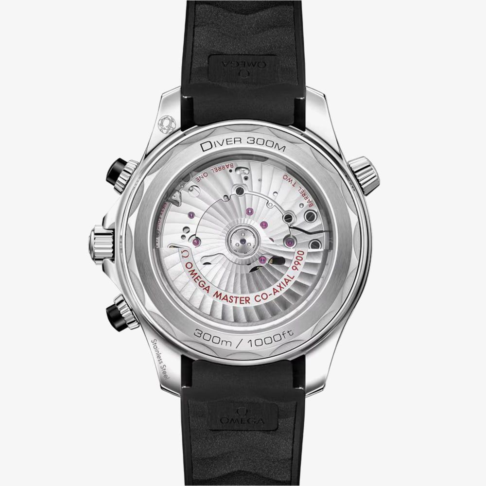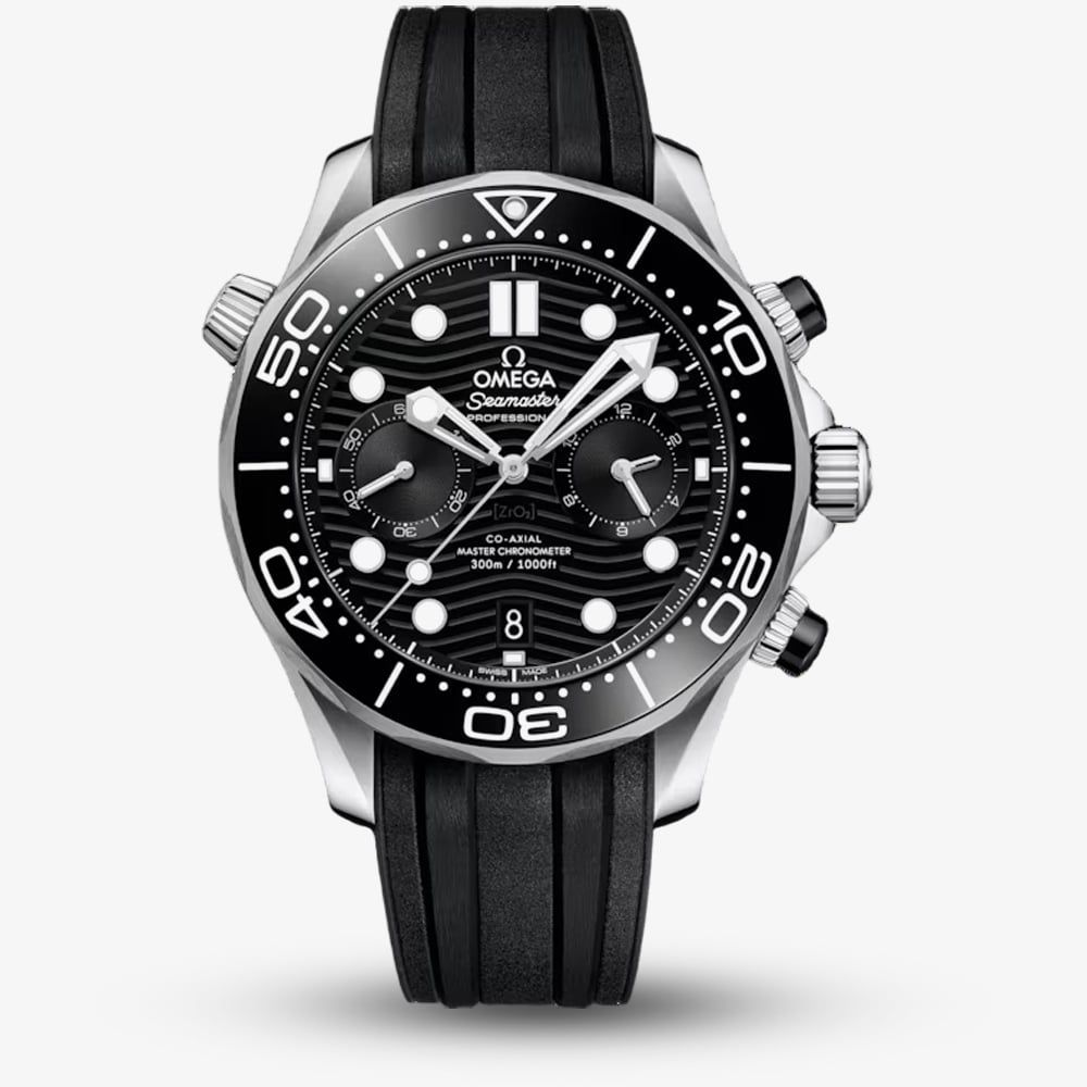 A modern take on a legend, this 44 mm Seamaster Diver 300M Chronograph blends OMEGA’s ocean heritage with advanced design. Crafted from stainless steel, it features a polished black ceramic bezel with a white enamel diving scale, matching ceramic pushers, and a black ceramic dial with laser-engraved waves and a date window at 6 o’clock. Rhodium-plated hands and indexes filled with white Super-Lumi Nova ensure clear visibility. The watch comes on a black rubber strap and is powered by the METAS-certified Master Chronometer Calibre 9900, visible through the wave-edged sapphire-crystal case back. Water resistant to 300 metres, it delivers both style and performance.