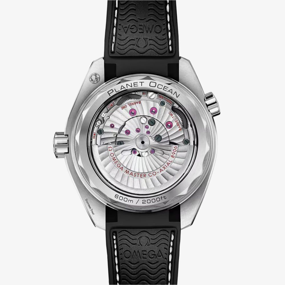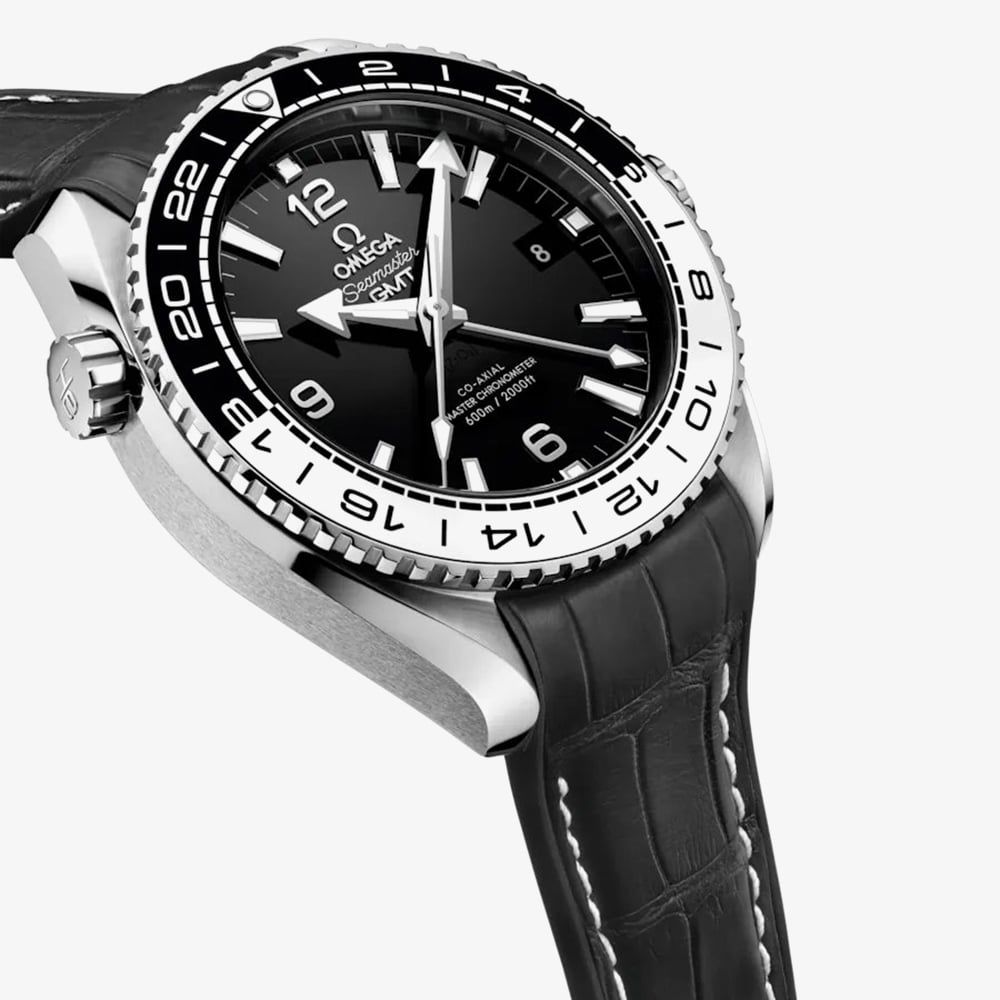 Paying tribute to OMEGA’s maritime legacy, the Seamaster Planet Ocean 600M Master Chronometer GMT blends style and technical excellence. The 43.5 mm stainless steel case houses a black ceramic dial with Arabic numerals, a date window at 3 o’clock, and a central GMT hand. A scratch-resistant sapphire crystal protects the dial, while the innovative black and white bi-ceramic bezel distinguishes day from night. Built for the depths, the watch is water resistant to 600 metres (2000 feet) and features a helium-escape valve and alveol screw-in case back. It comes on a black leather strap with a rubber lining for comfort and durability. At its heart is the OMEGA Master Chronometer calibre 8906, visible through the transparent case back. Certified by METAS, it meets the highest standards of precision, performance, and magnetic resistance.