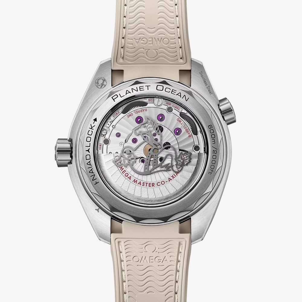 This 43.5mm timepiece is built from robust brushed stainless steel and boasts a sleek bronze-coloured ceramic bezel ring engraved with a diving scale in Liquid ceramic. For optimal legibility, the OMEGA logo, numerals, hands, and hour markers are crafted from brushed PVD grey and coated with white Super-LumiNova that glows in low light. The beating heart of this Seamaster Planet Ocean is the Co-Axial Master Chronometer Calibre 8900, a testament to precision. On the case back, the NAIAD LOCK system is showcased with a metallic seahorse emblem on the sapphire crystal.