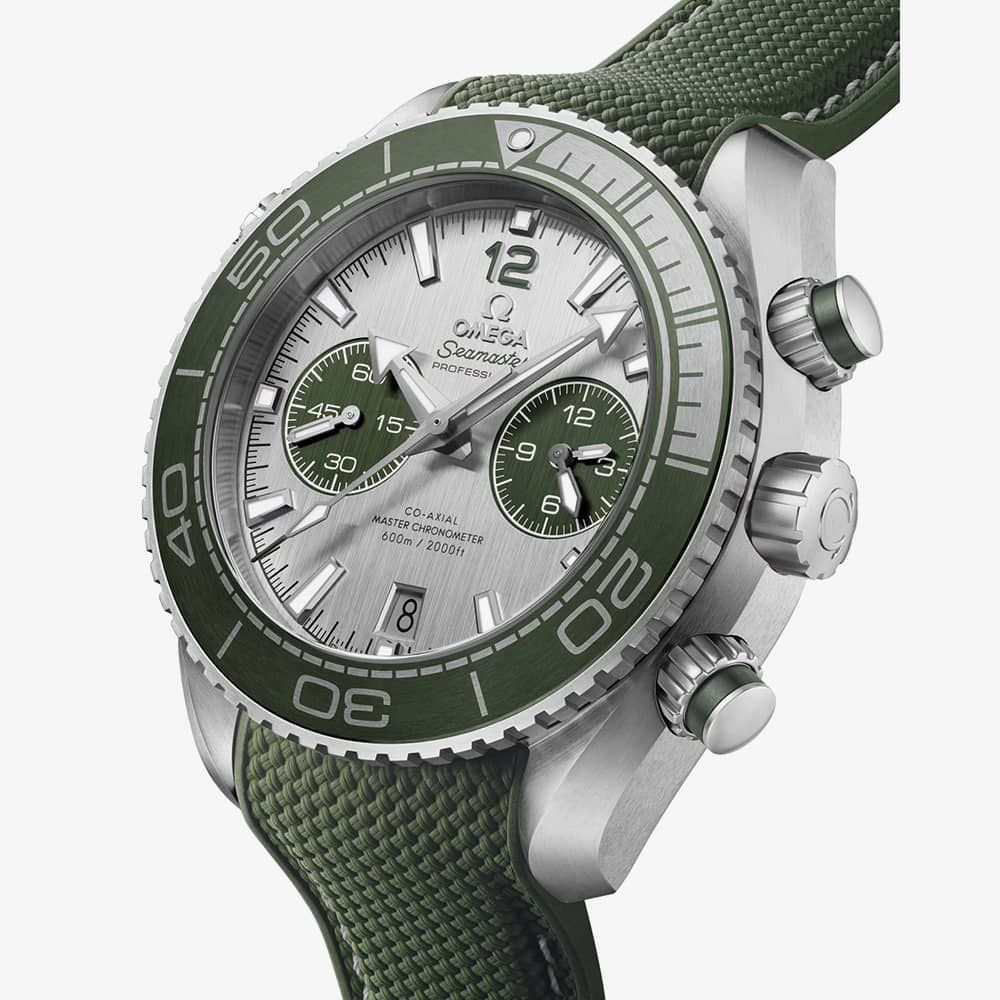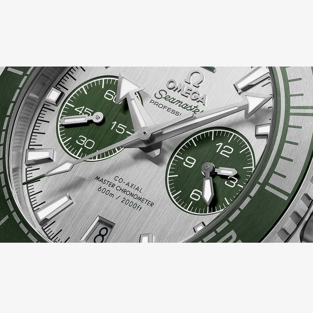 Inspired by OMEGA’s rich maritime heritage, the Seamaster Planet Ocean made its debut in 2005. This watch features a brushed green ceramic bezel ring housing Liquidmetal™-accented diving scale and domed sapphire crystal with anti-reflective treatment on inside. Powered by the Co-Axial Master Chronometer Calibre 9900, this Seamaster Planet Ocean model adorns an integrated green rubber strap featuring a textured motif and accents of light grey and green stitching. The NAIAD LOCK case back showcases a metallised seahorse motif against the backdrop of sapphire crystal.