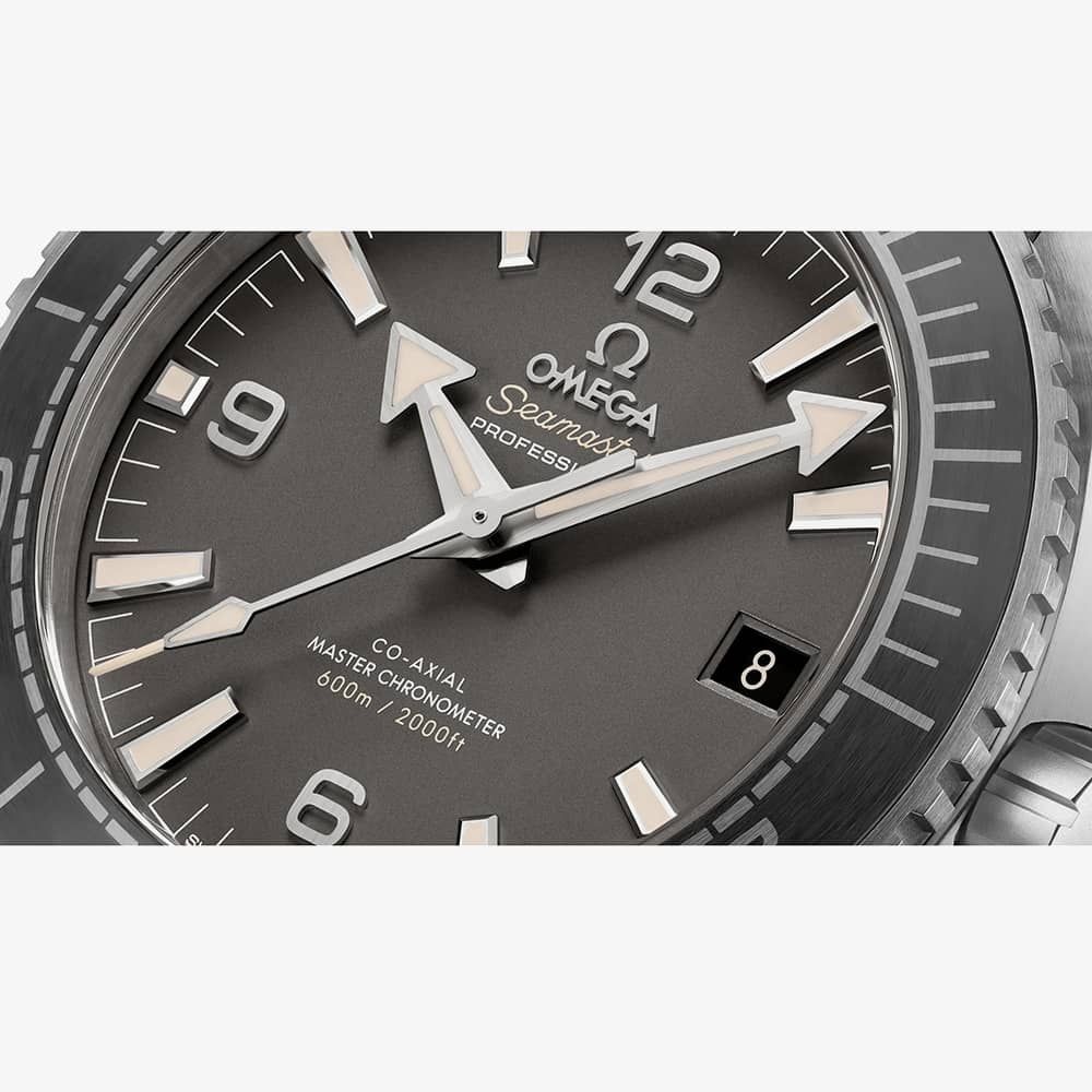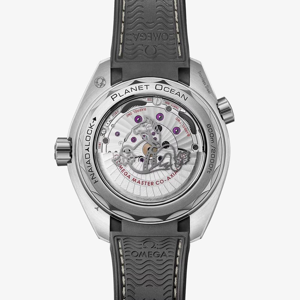 This 43.5mm timepiece is built from robust brushed stainless steel and boasts a sleek black ceramic bezel ring engraved with a diving scale in Liquidmetal. For optimal legibility, the OMEGA logo, numerals, hands, and hour markers are crafted from brushed PVD stainless steel and coated with beige Super-LumiNova that glows in low light. The beating heart of this Seamaster Planet Ocean is the Co-Axial Master Chronometer Calibre 8900, a testament to precision. On the case back, the NAIAD LOCK system is showcased with a metallic seahorse emblem on the sapphire crystal.