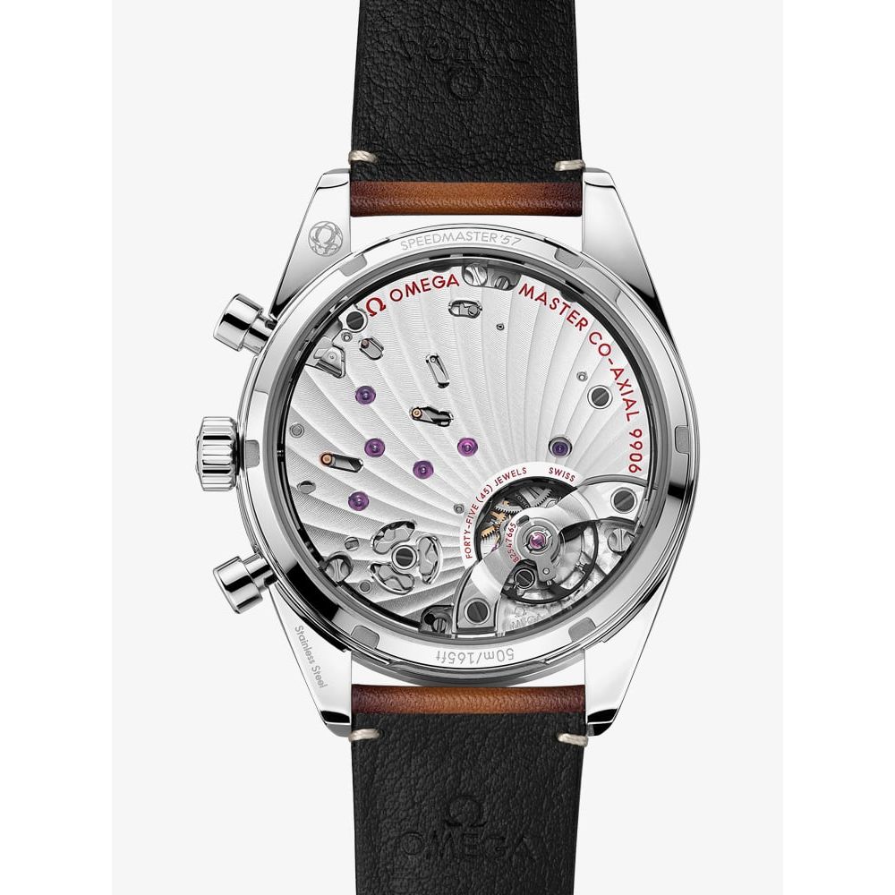 The OMEGA Speedmaster 57 Co-Axial Master Chronometer Chronograph 332.12.41.51.01.001 watch combines a 40.5mm round shaped stainless-steel case with a brushed blackened tachymeter scale and brown leather strap with a traditional buckle. It has a black analogue dial with Super-LuminNova hands, a date display at 6oclock position & chronograph sub-dials which are protected beneath a scratch resistant sapphire crystal glass with an anti-reflective treatment on both sides. Power is generated by the automatic movement with a power reserve of up to 60 hours, a Co-Axial escapement & a Certified Master Chronometer. This OMEGA watch is Anti-Magnetic, has a time zone function & a transparent case back with the engraving SPEEDMASTER 57. This model also has a water resistance of up to 50 metres.