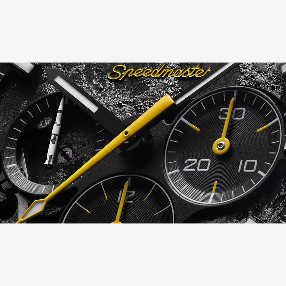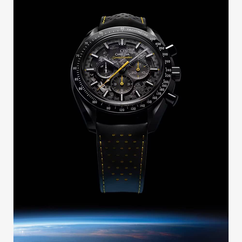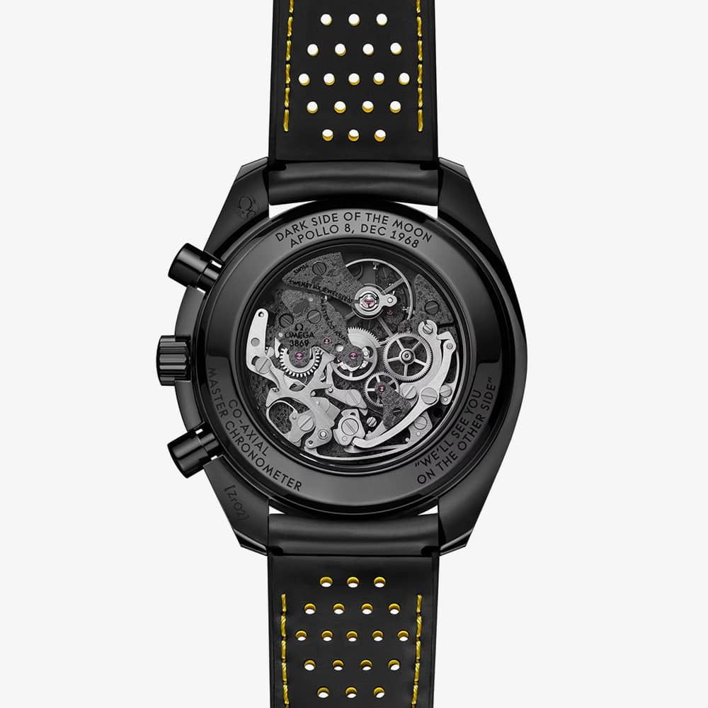 Adorned with a perforated black rubber strap featuring a yellow rubber interior, the entire watch is crafted from black ceramic. The small-seconds subdial features a patent-pending grade 5 titanium hand shaped like the Saturn V rocket, achieved through precise laser turning. Powering this exceptional timepiece is the OMEGA Co-Axial Master Chronometer Calibre 3869, housed within.