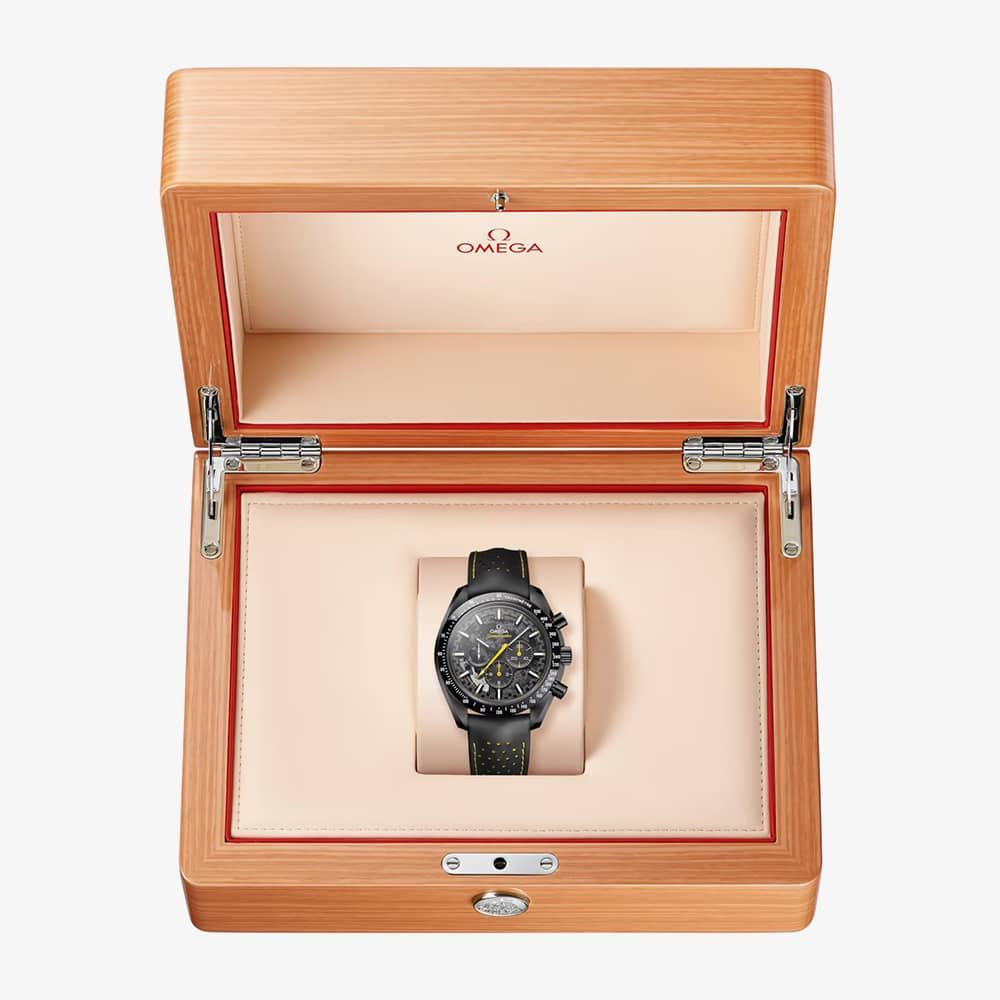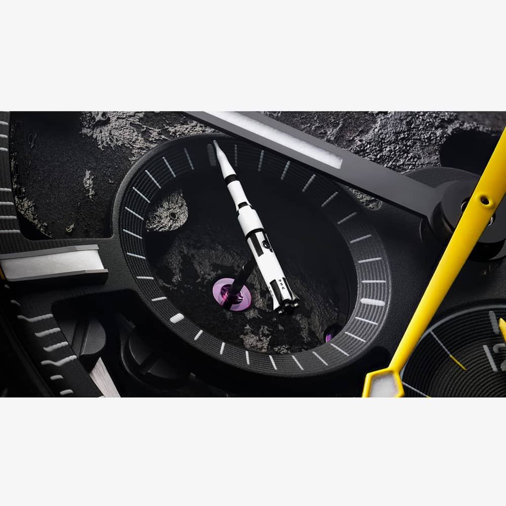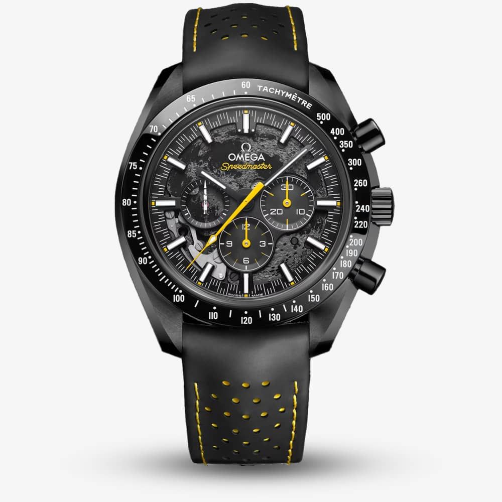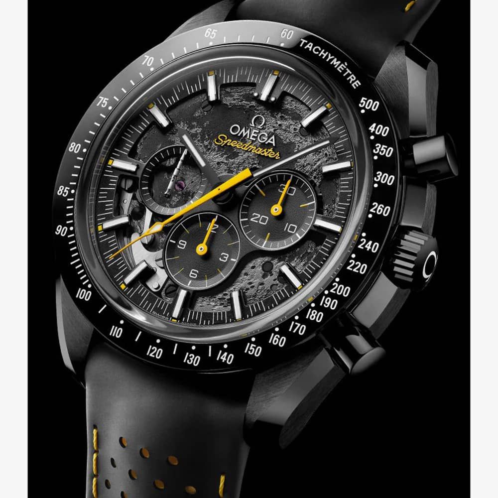 Adorned with a perforated black rubber strap featuring a yellow rubber interior, the entire watch is crafted from black ceramic. The small-seconds subdial features a patent-pending grade 5 titanium hand shaped like the Saturn V rocket, achieved through precise laser turning. Powering this exceptional timepiece is the OMEGA Co-Axial Master Chronometer Calibre 3869, housed within.