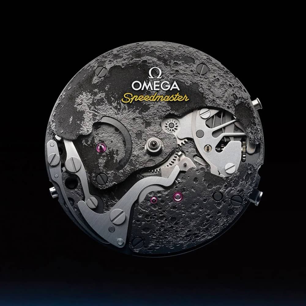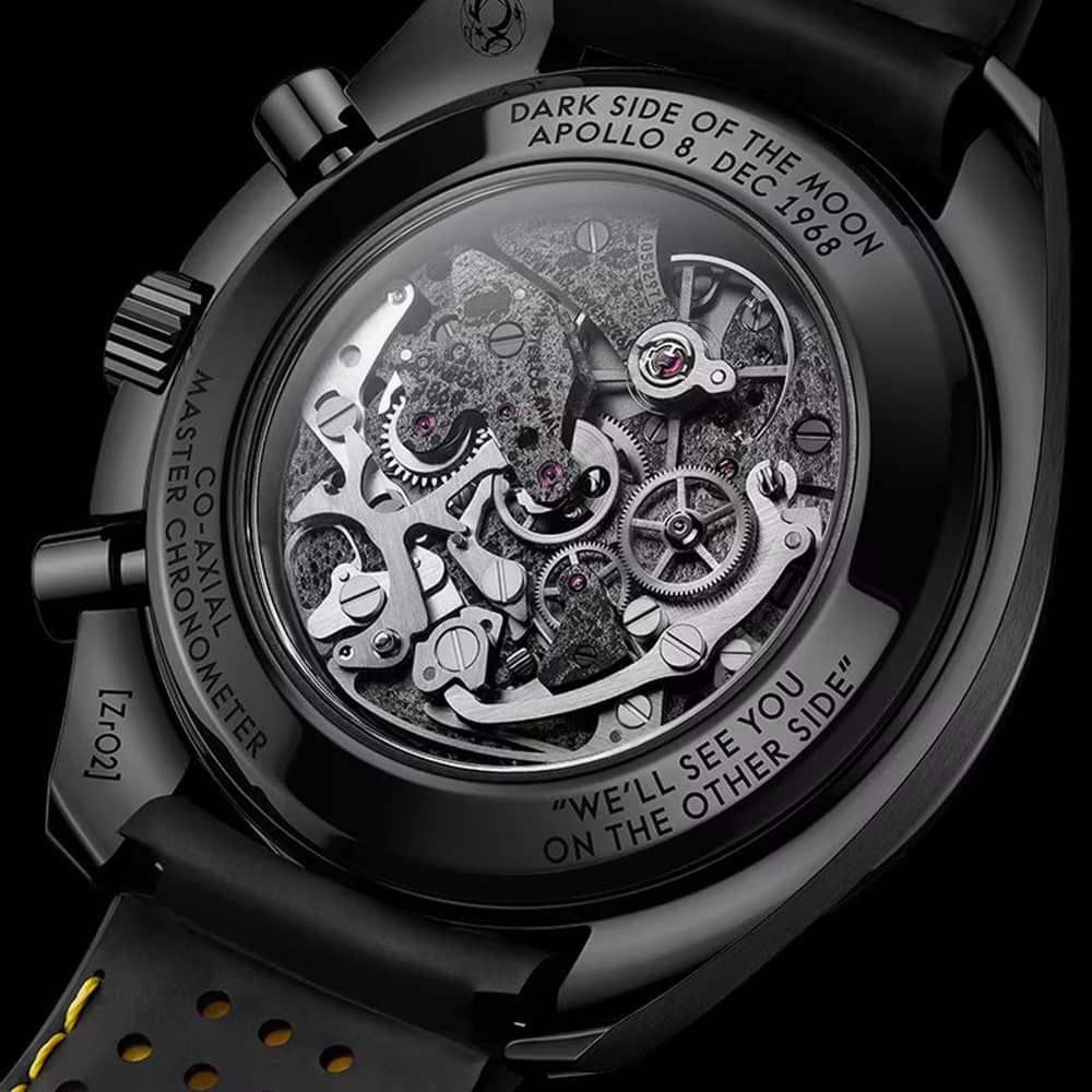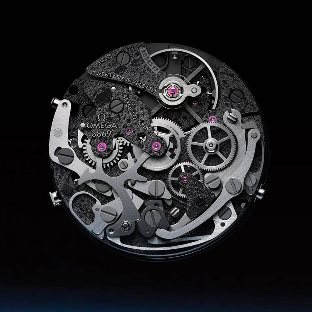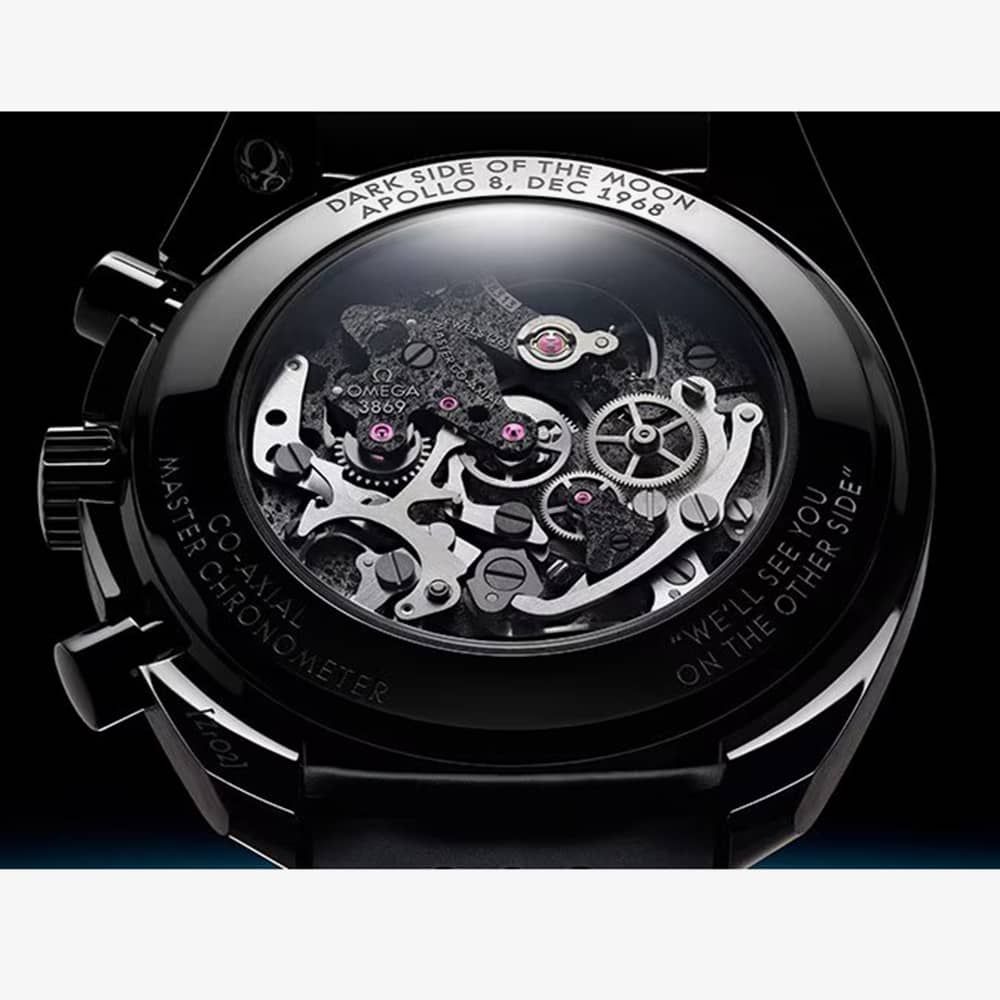This watch commemorates the Speedmaster's historic journey aboard the Apollo 8 mission with a distinctive design. The movement is adorned with a blackened finish, meticulously laser-ablated on the main plate and bridges to mirror the rugged terrain of the moon's surface. The skeletonised black anodised aluminium dial offers a glimpse of the near side, while the case back reveals the far side.