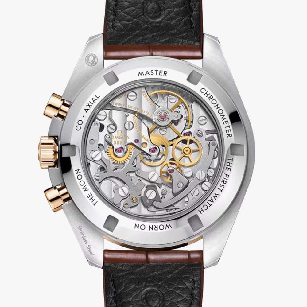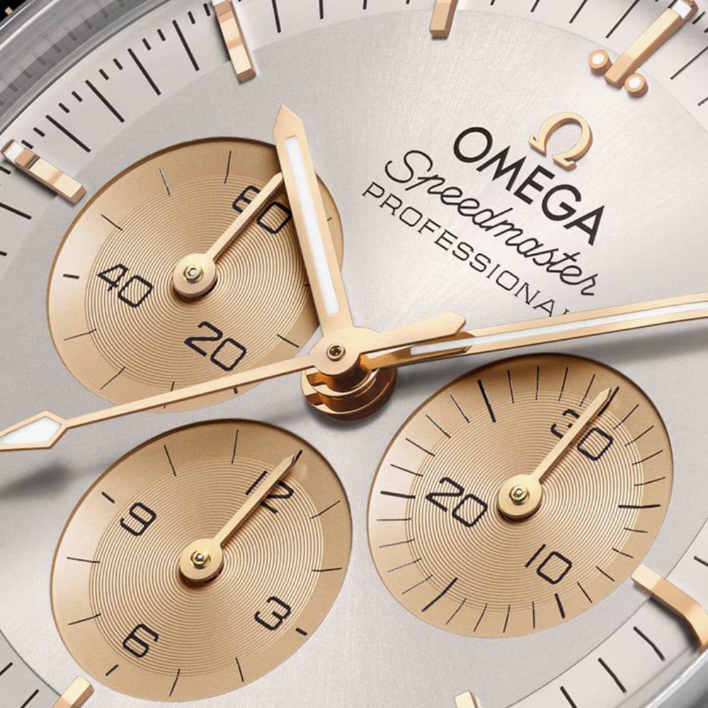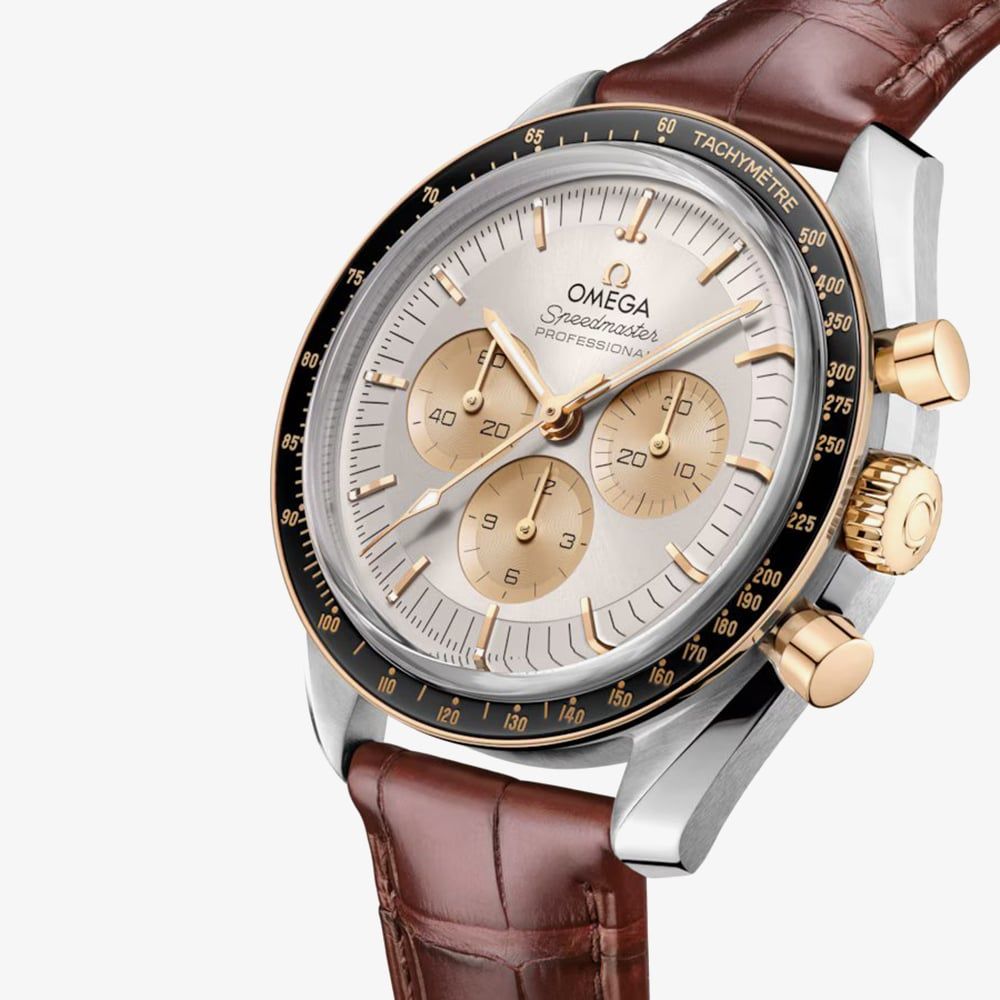 This 42mm bi-colour model combines stainless steel and 18K Moonshine Gold, featuring sapphire crystal glass on both the front and case back. Inspired by the fourth-generation Speedmaster worn on the moon, it showcases an asymmetrical case with a black ceramic bezel ring that includes a tachymeter scale and the renowned dot over ninety in OMEGA Ceragold