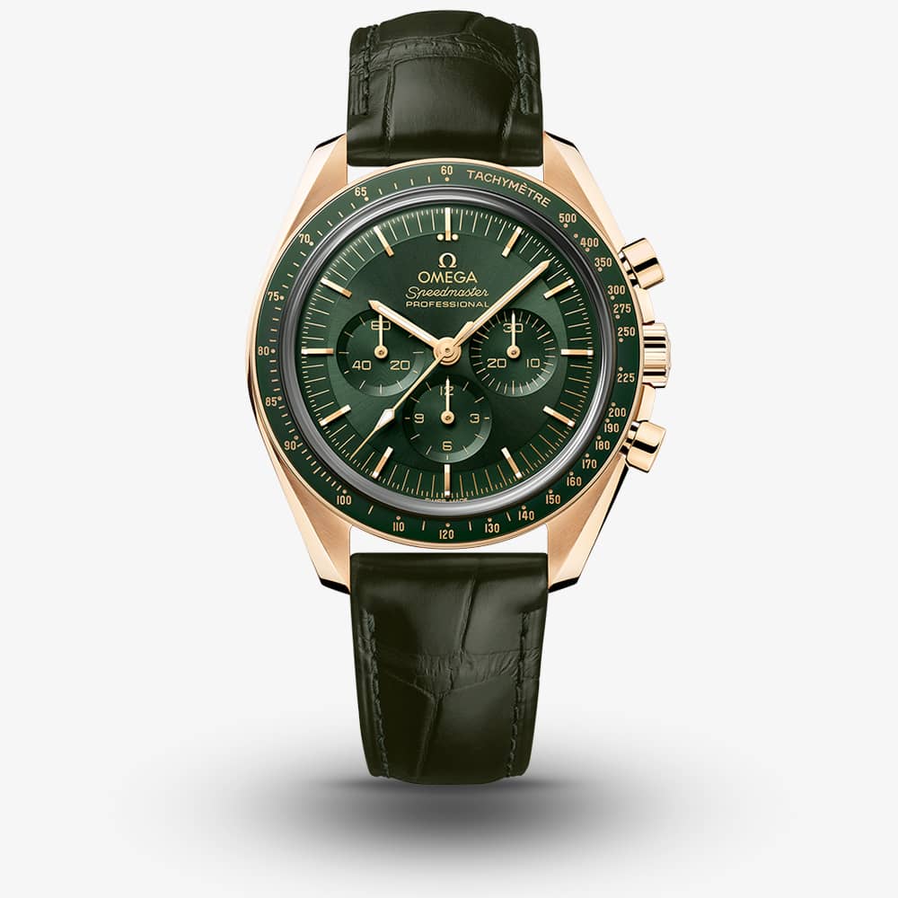 The OMEGA Speedmaster Moonwatch Chronograph Brown Leather Strap Watch 310.60.42.50.10.001 watch combines a 42mm round shaped 18k Moonshine ™ gold case with a green ceramic bezel with the OMEGA Ceragold ™ tachymeter scale and a green leather strap with a fold over clasp. It has a sun-brushed green PVD 18k Moonshine ™ Gold analogue dial with luminescent hands & chronograph sub-dials which are protected beneath a scratch resistant sapphire crystal glass with anti-reflective treatment on the inside. Power is generated by the automatic movement with a power reserve of up to 50 hours, a Co-Axial escapement & a Certified Master Chronometer. This OMEGA watch is Anti-Magnetic & has a transparent case back with the words FIRST WATCH WORN ON THE MOON engraved. This model also has a water resistance of up to 50 metres.