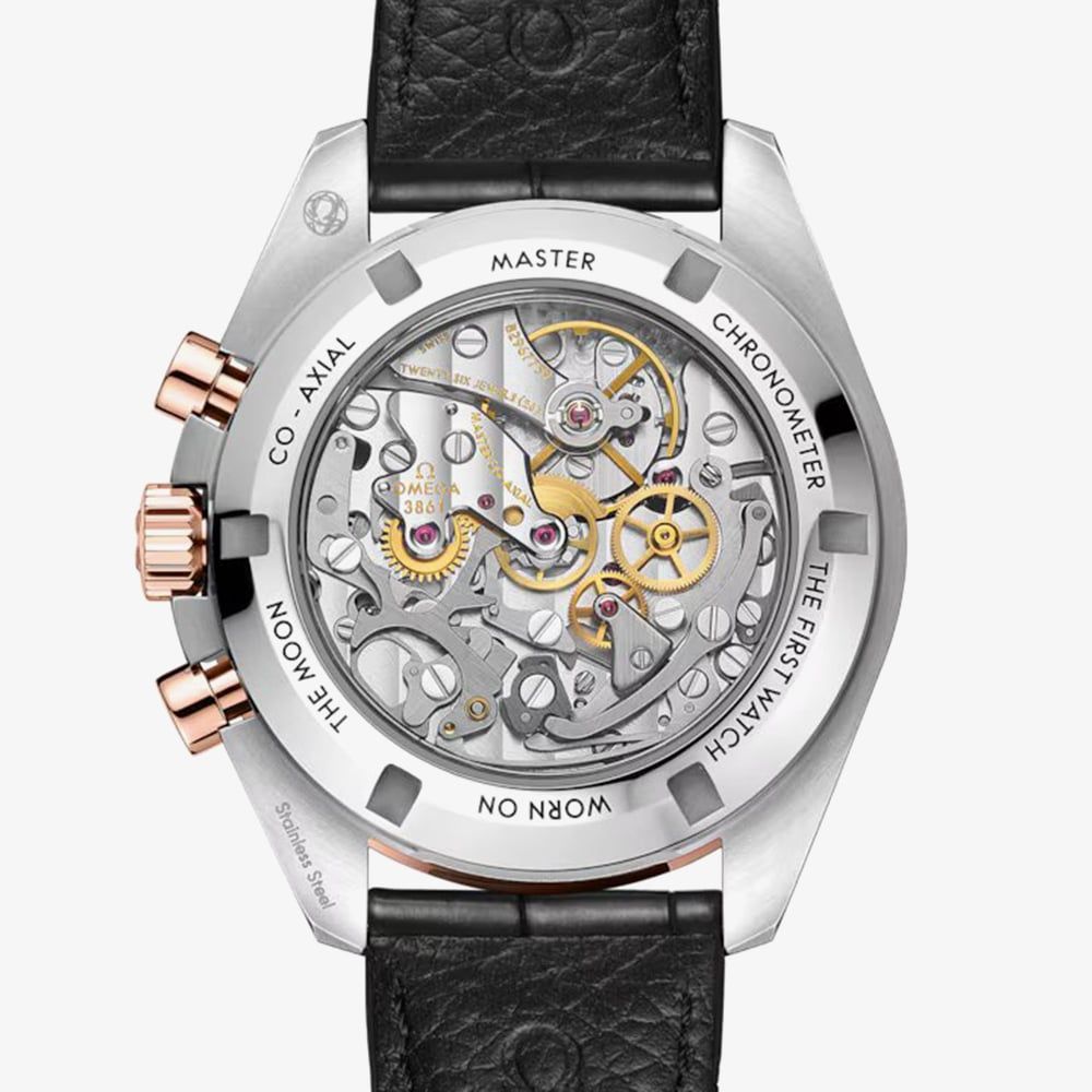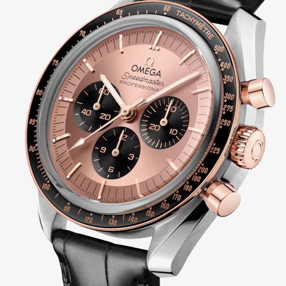 This 42mm bi-colour model features a stainless steel case combined with 18K Sedna Gold and is protected by sapphire crystal glass on both the front and case back. Inspired by the fourth-generation Speedmaster worn on the moon, it showcases an asymmetrical case with a black ceramic bezel ring that includes a tachymeter scale and the notable dot over ninety in OMEGA Ceragold.