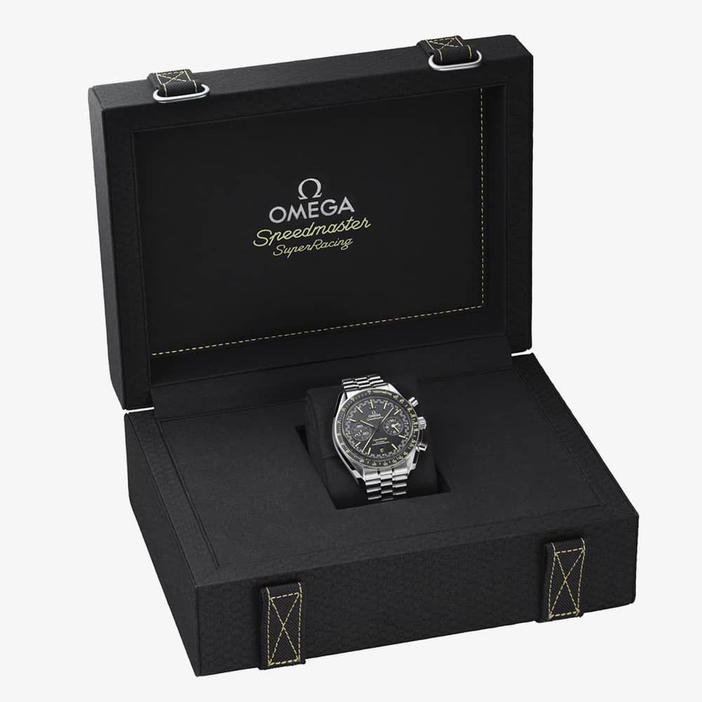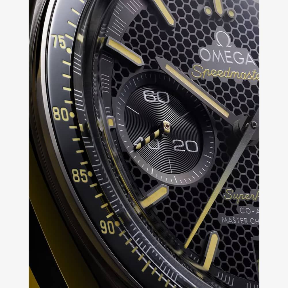 At its heart lies OMEGA’s Co-Axial Master Chronometer 9920 movement, certified by METAS to the highest industry standards. It notably incorporates OMEGA's patent-pending Spirate™ System, a first-of-its-kind innovation in watchmaking. Delivered in a stylish honeycomb-patterned Speedmaster watch box with black and yellow stitching, the timepiece comes accompanied by a recycled nylon NATO strap featuring alternating black and yellow stripes.