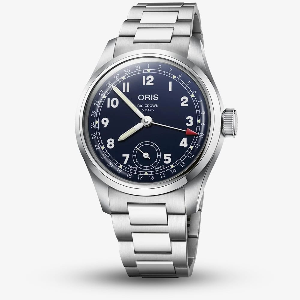 The Oris Big Crown Pointer Date combines classic elegance with modern innovation. Its midnight blue dial features the signature Pointer Date and a small seconds at 6 o’clock, powered by the advanced Calibre 403 automatic with a five-day power reserve and elevated anti-magnetism. Housed in a multi-piece stainless steel case with double-domed sapphire crystal and a see-through sapphire case back, it’s finished with a sleek H-link bracelet and ergonomic clasp for refined comfort.