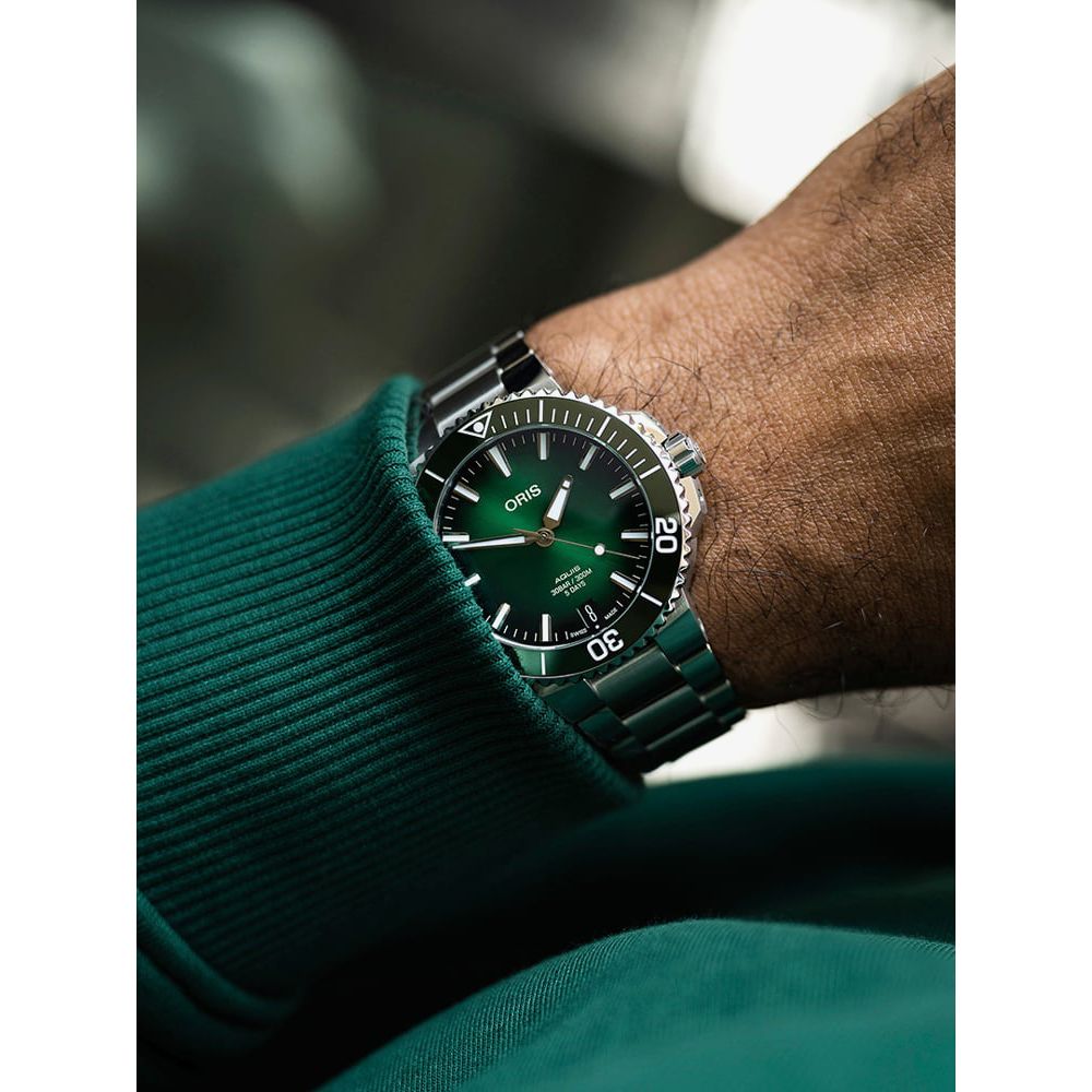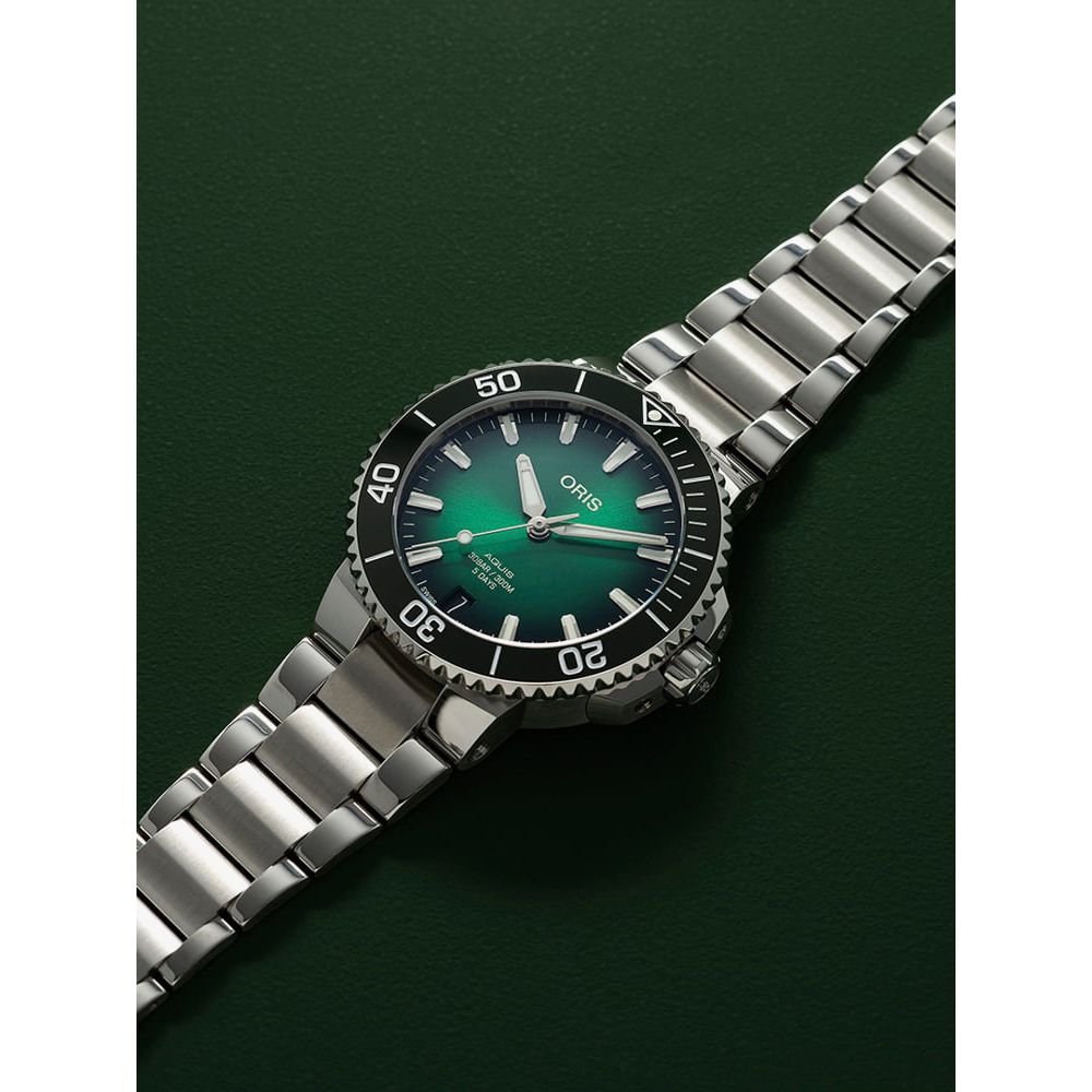 The Oris 01 400 7769 4157-07 8 22 09PEB contains the new in-house automatic winding movement created by Oris; the Calibre 400. Features of this movement include being highly resistant to magnetism due to the silicon components within the movement, a five day power reserve (120 hours) and a 10 year warranty*. In addition, the Calibre 400 movement is highly accurate (to -3/+5 seconds a day). This watch combines a 41.5mm stainless steel case with a ceramic bezel and a stainless steel bracelet with a push button deployment clasp. It has a green dial with Superluminova indices and hands, and a date function at six o-clock, which is protected beneath sapphire crystal glass. This model also has a water resistance of up to 300 metres. *When you register at MyOris.