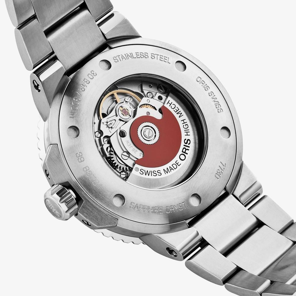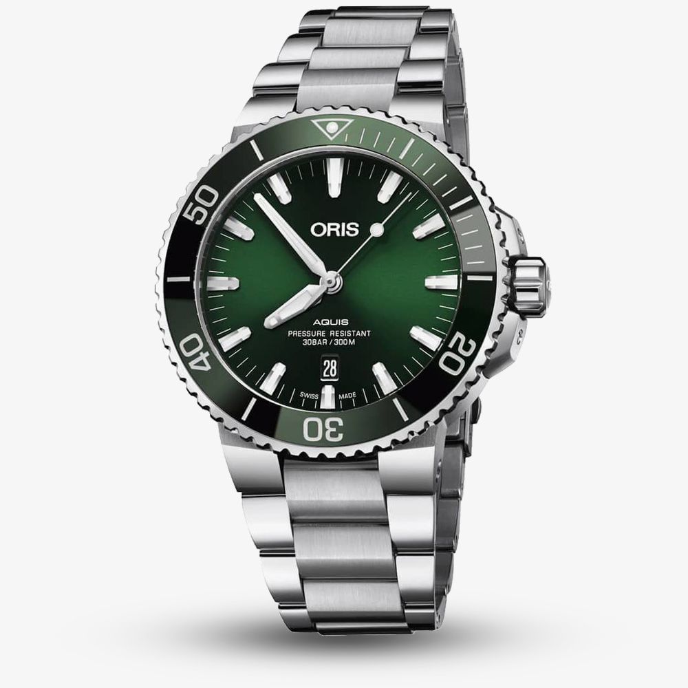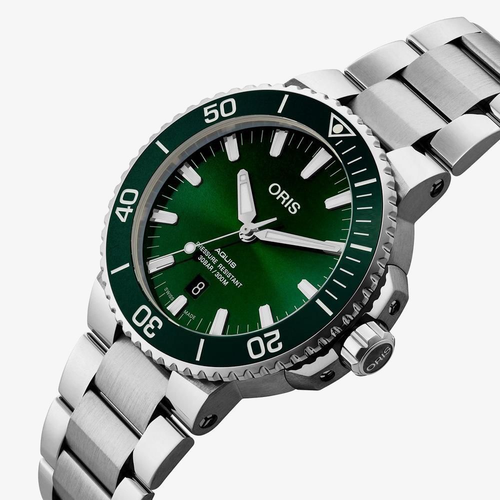 Oris introduce this new addition to the Aquis series. Crafted from sturdy stainless steel, the timepiece features a sturdy durable bracelet complete with a deployment clasp. A 60 minute ceramic bezel surrounds the green tone dial protected by domed sapphire crystal anti-reflective glass.