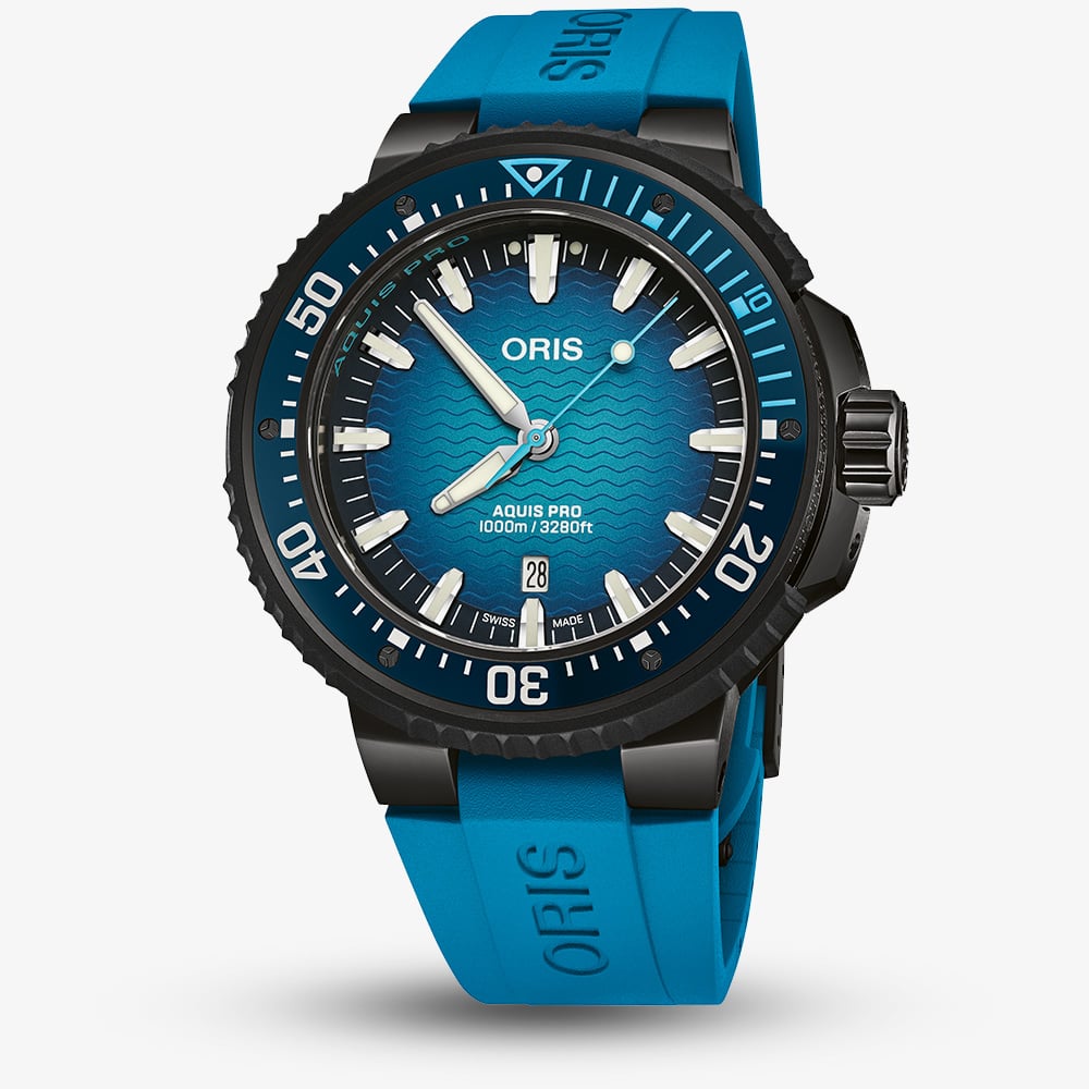 The Oris Aquis Pro 1000m is a high-performance dive watch built for serious underwater exploration. Its bold blue wave dial is housed in a grey-plated titanium case with a durable ceramic minutes bezel. Featuring centre hands for hours, minutes and seconds, plus an instantaneous date window with quick corrector and stop-second function, it delivers precision when it matters most. Developed with professional divers to ensure this watch performs to the highest standard, it boasts an impressive 1000m water resistance and comes with both a blue rubber strap and a black rubber strap for maximum versatility. A rugged, reliable tool watch crafted for adventure.