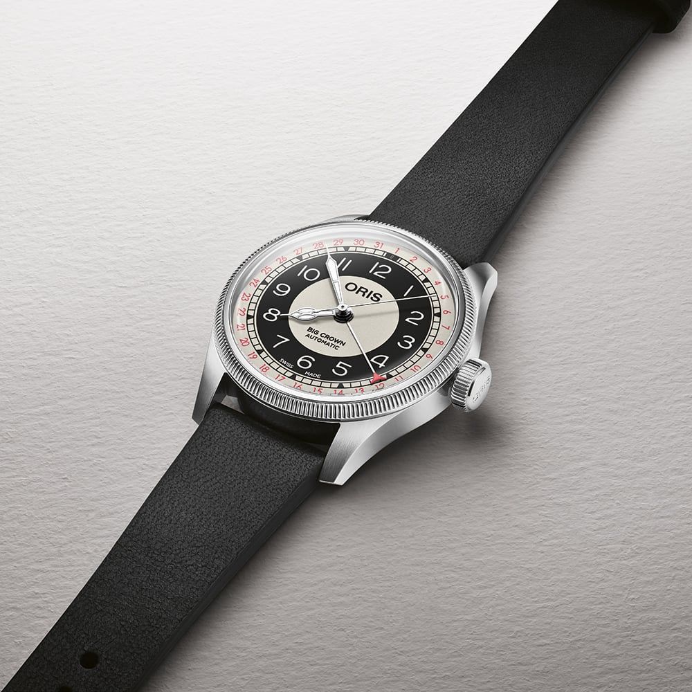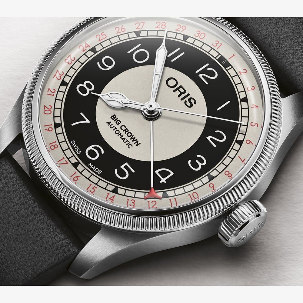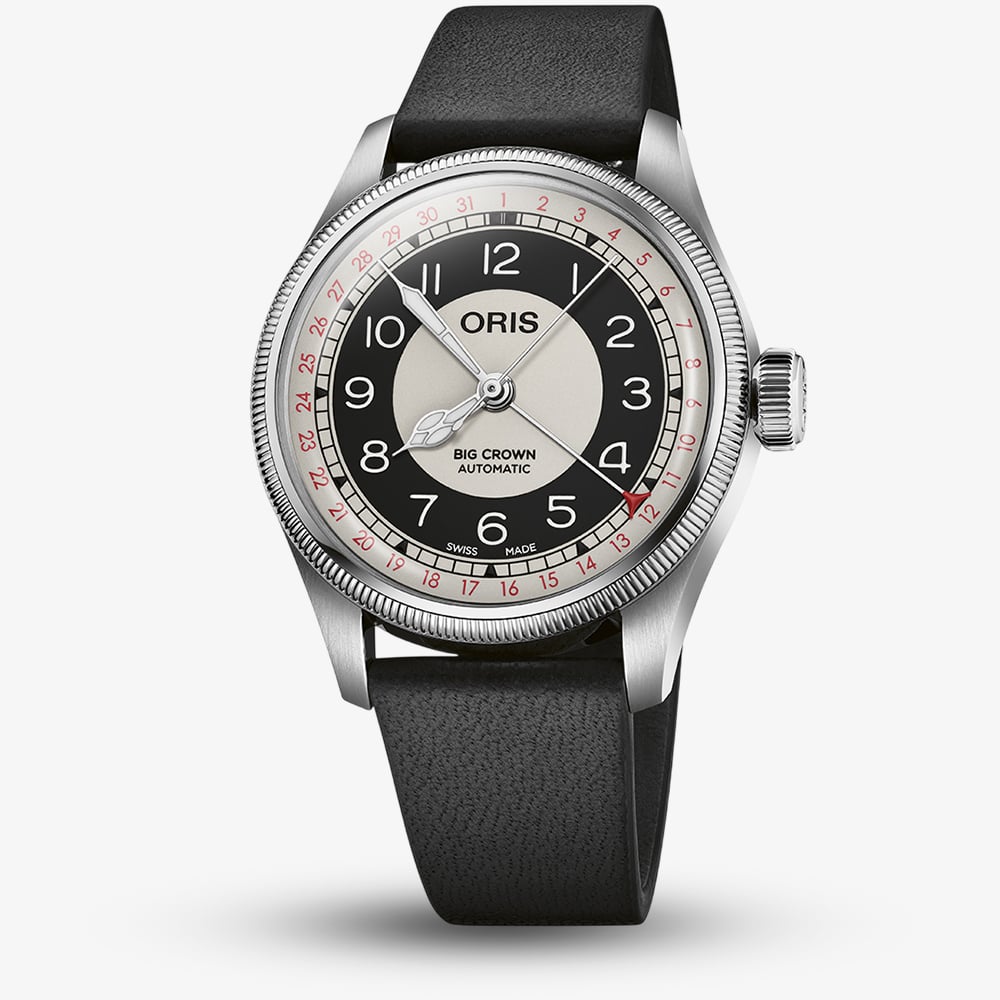 https://www.thbaker.co.uk/oris-mens-big-crown-bullseye-pointer-date-black-leather-strap-watch-754-7779-4061-07-5-19-25175765Oris Mens Big Crown 'Bullseye' Pointer Date Black Leather Strap Watch 754 7779 4061-07 5 19 25https://www.thbaker.co.uk/media/catalog/product/o/r/oris-01-754-7779-4061-07-5-19-25-big-crown-pointer-date-bullseye_01.jpg18001800GBPInStock/Watches/Watches/Mens Watches/Brands A-Z/Oris Watches/Watches/Swiss Watches/Brands A-Z/Oris Watches/Oris Mens/Brands A-Z/Oris Watches/Oris Aviation/Brands A-Z/Oris Watches/Oris Aviation/Big Crown/Watches/Pilot Watches/Free Gift Card - When you spend £500+/Watches/Luxury Watches/Mens Luxury Watches/£100 Gold Gift Card (£1000 - £2000)/Watches/Luxury Watches/Watches/Automatic Watches/Watches/Strap Watches/Leather Strap Watches/Flash Sale/Admin/Free Gift With Purchase Products3626362744584692491557975888571072347358739564434675467780427633123626479244585797644367616413Almost three decades after its last appearance, the Oris Big Crown Pointer Date Bullseye returns as a confident expression of independent Swiss watchmaking. Referenced as 754 7779 4061-07 5 19 25, this 38mm stainless steel model balances vintage character with everyday practicality. The cool grey and black dial, punctuated by subtle red accents, delivers strong legibility and visual depth, while the signature pointer date hand sweeps smoothly around the dial, a detail long associated with the Big Crown lineage. Domed sapphire crystal with internal anti reflective coating adds clarity and a pleasing sense of curvature on the wrist.
