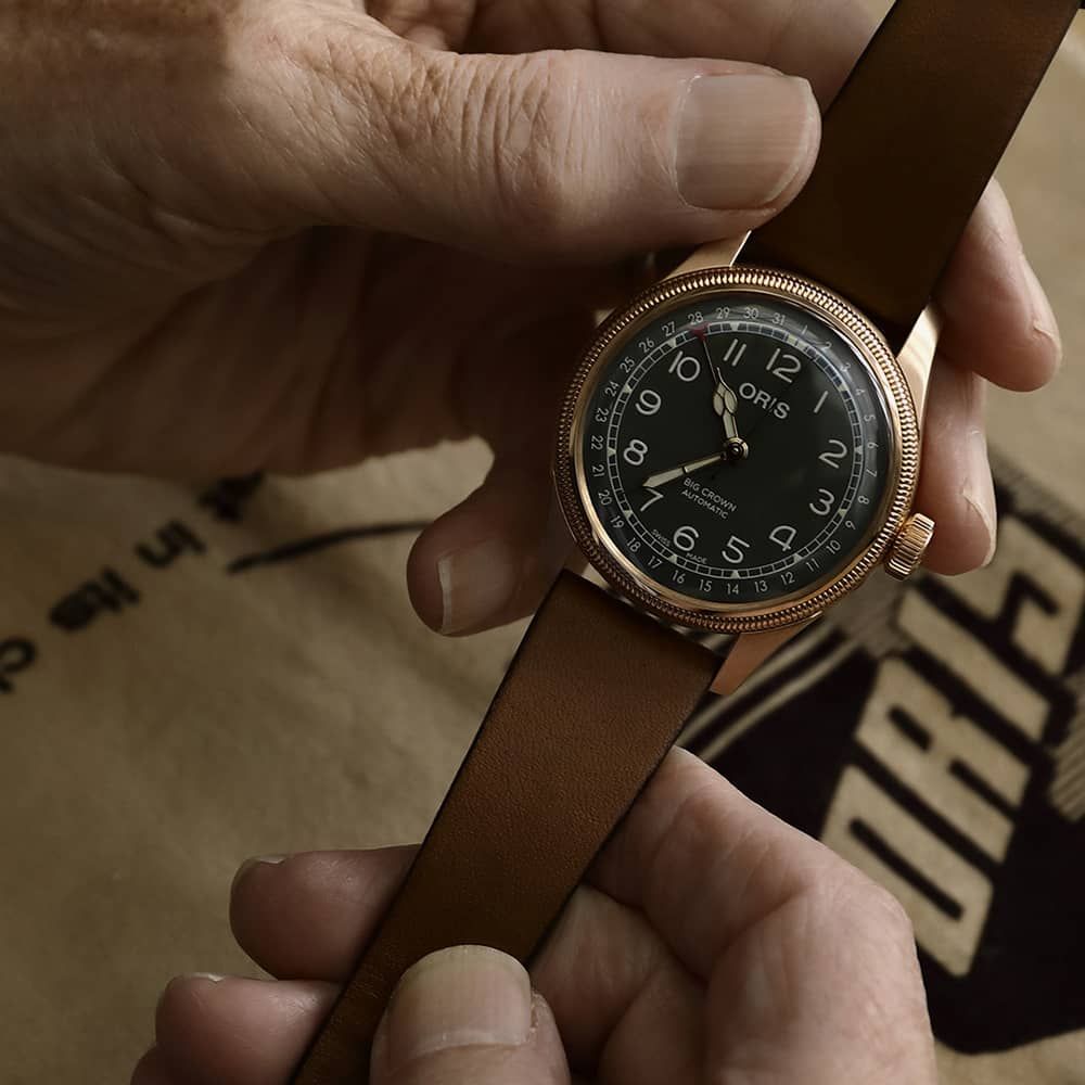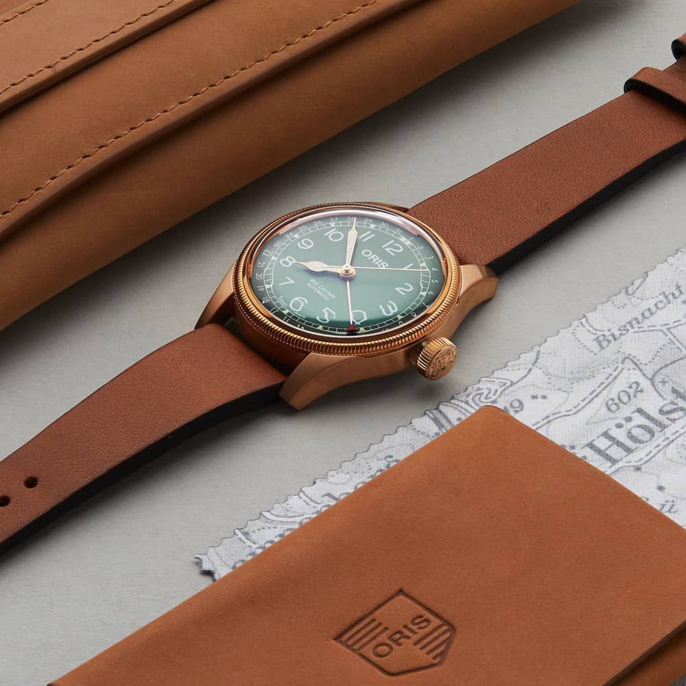 In celebration of the 80th anniversary of the Oris big crown pointer date collection, they have released this special bronze edition with a green dial. With a sleek brown leather strap, the combination of materials and colours is symbolic of the watch's design history.
