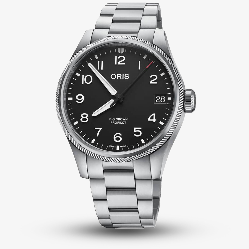 The Oris 01 751 7761 4164-07 8 20 08 Big Crown ProPilot watch combines a 41mm round shaped stainless steel case and bracelet with a fold over clasp. It has a black analogue dial with Superluminova coated hands and numerals and a date display, all of which is protected beneath domed scratch resistant sapphire crystal glass with an anti-reflective coating inside. Power is generated by the Oris 751 automatic movement with 26 jewels and a power reserve of up to 38 hours. This model also has a transparent mineral crystal case back, a screw-in security crown, and a water resistance of up to 100 metres.