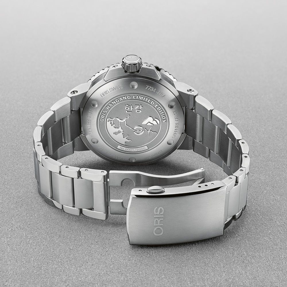 Oris introduces this Limited Edition to the Aquis series. This Hangang model is crafted from stainless steel, the piece features a sturdy and durable link bracelet equipped with a push button deployment clasp, as well as a green ceramic bezel hosting a 60 minute scale. Protecting the dial is a domed sapphire crystal with anti-reflective coating applied inside, improving legibility during bright light. The green dial is decorated with silver tone hour batons and dial hands which possess Superluminova coating, allowing the watch to be used even during low light. This model is capable of resisting up to 300 metres of water, demonstrating the ingenuity seen throughout the Aquis series. At the heart of this timepiece is a complex automatic movement with a power reserve of up to 38 hours, which can be observed and admired via the transparent mineral crystal case back.